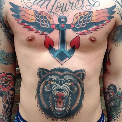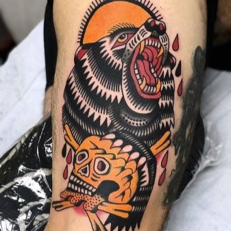 - Vieille école. Des couleurs vives et juteuses, un contour noir clair obligatoire.Ces traits caractéristiques du style sont particulièrement appréciés par les personnes qui préfèrent que les tatouages soient une partie reconnaissable de leur style. Les images permettent une certaine ironie dans l'intrigue du dessin ; il est parfois difficile de reconnaître un ours dans un animal étrange. La palette de couleurs permet d'utiliser non seulement des tons monochromes, mais également des nuances de jaune, de rouge et de vert.