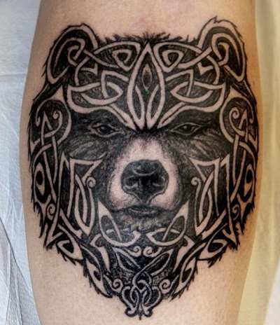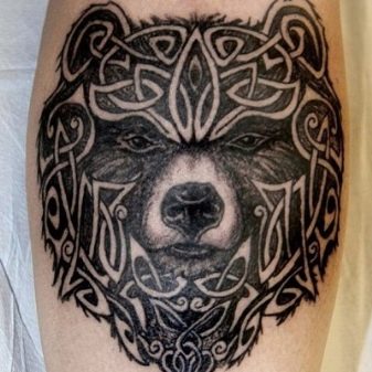 - Celtique... Des lignes strictes et claires, des motifs laconiques s'entrelaçant en nœuds. Tout cela est typique de l'un des styles les plus populaires. L'image d'un ours dans ce cas sera plutôt primitive, monochrome, le plus souvent le symbolisme de l'empreinte ou de la tête de la bête est utilisé.