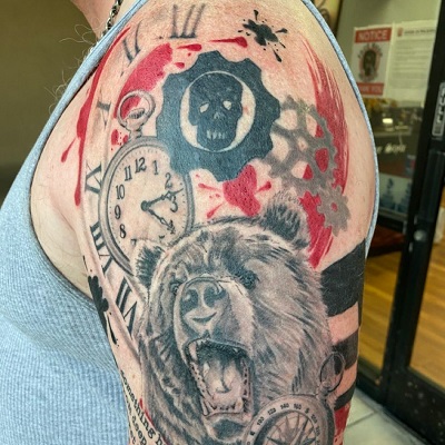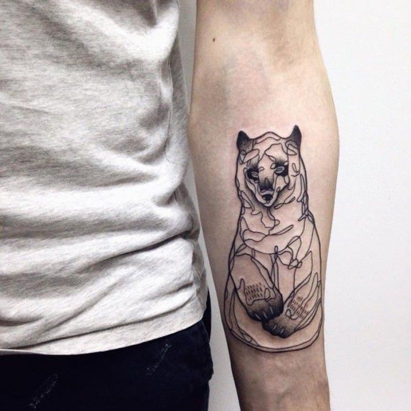 Option traditionnelle une démonstration de force silencieuse - un tatouage avec un sourire d'ours sur toute la surface du bras, de l'épaule au poignet. C'est le signe d'une personne impérieuse, confiante, qui n'a pas peur d'une attention excessive à sa personne.