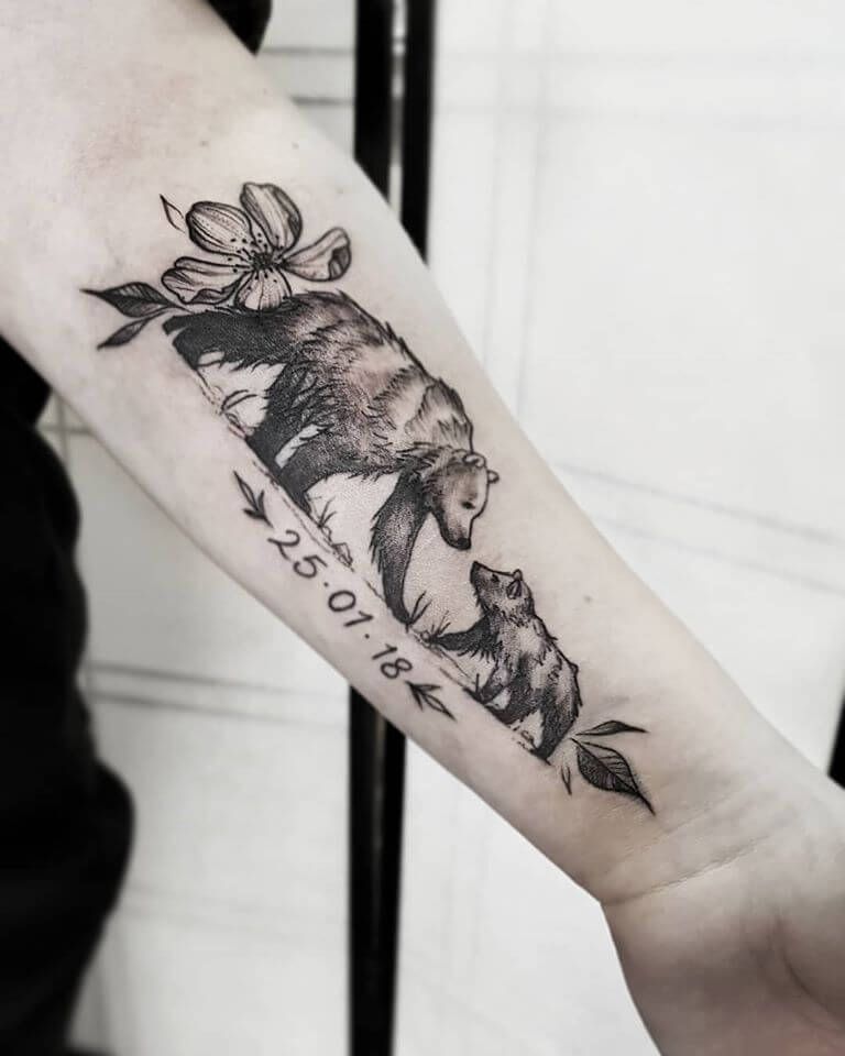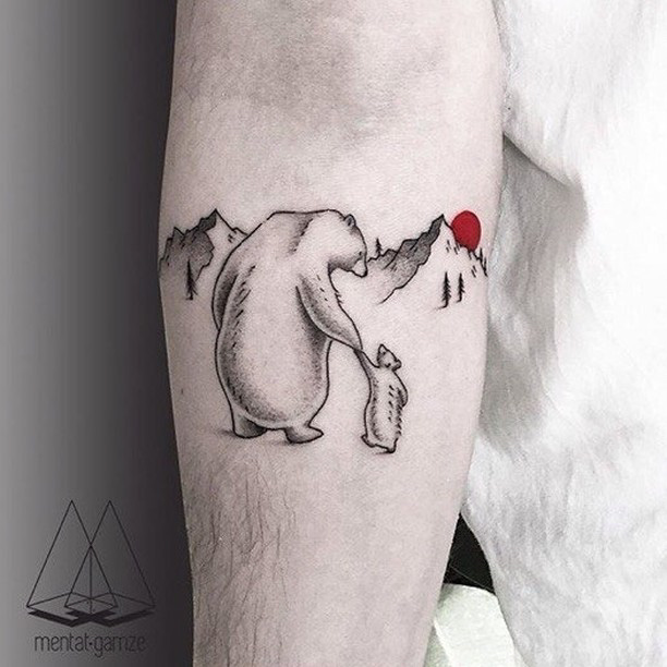 - Ours avec des oursons... C'est un symbole de devoir paternel et de fierté. Cela peut aussi être l'expression d'une volonté de défendre la famille. Un autre complot similaire d'un tatouage est considéré comme la désignation d'un mentor enseignant aux jeunes.