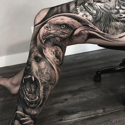 Ces parties du corps sont rarement affichées par les hommes dans la société. Mais si le tatouage est fourré sur la cuisse, alors c'est un symbole clair de démonstration de sa supériorité, ainsi que de l'activité sexuelle, de la force et du pouvoir. Les représentants des sports agressifs appliquent souvent des dessins ici: de la lutte à la boxe, maintenant ainsi la brutalité de leur image.