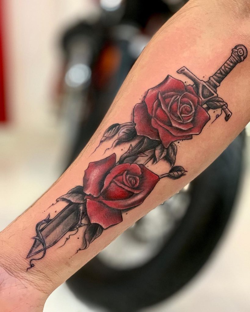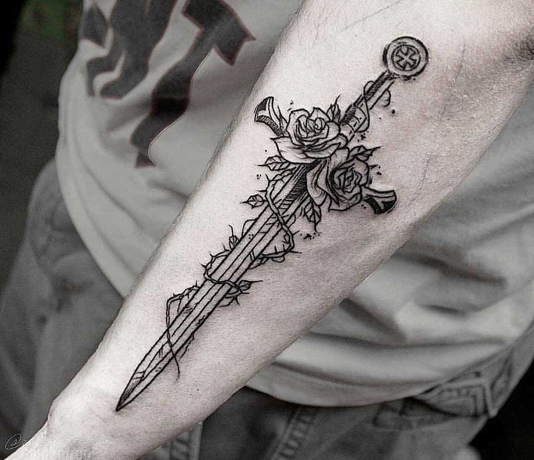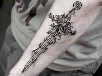 - Ces tatouages ont souvent un poignard ou une épée. Une telle image portable peut symboliser une énorme passion dans une relation amoureuse, ainsi qu'un type particulier d'amour, qui est contradictoire et peut même friser la haine.