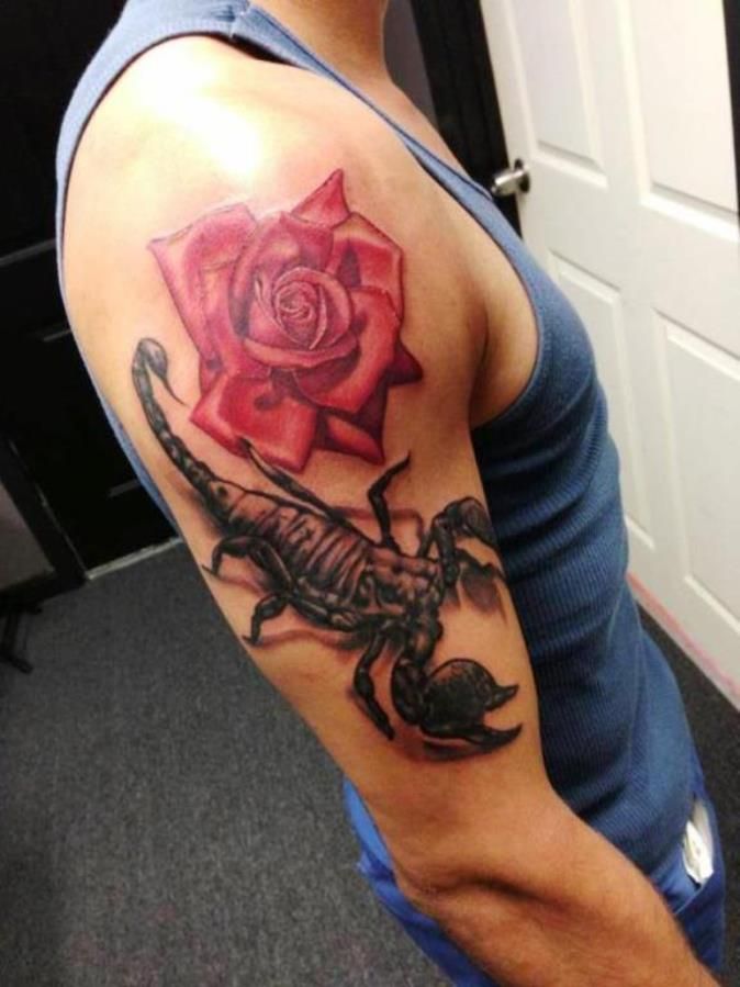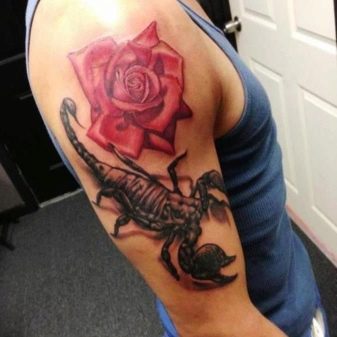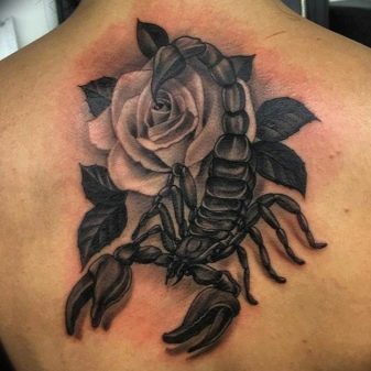 - Un croquis avec une rose et un scorpion est également très courant. Un tel tatouage a deux valeurs d'interprétation. Cela peut signifier une relation amoureuse complexe qui peut détruire l'âme humaine, la blesser, apporter beaucoup de souffrance, et cela peut aussi signifier la dévotion dans l'amour.