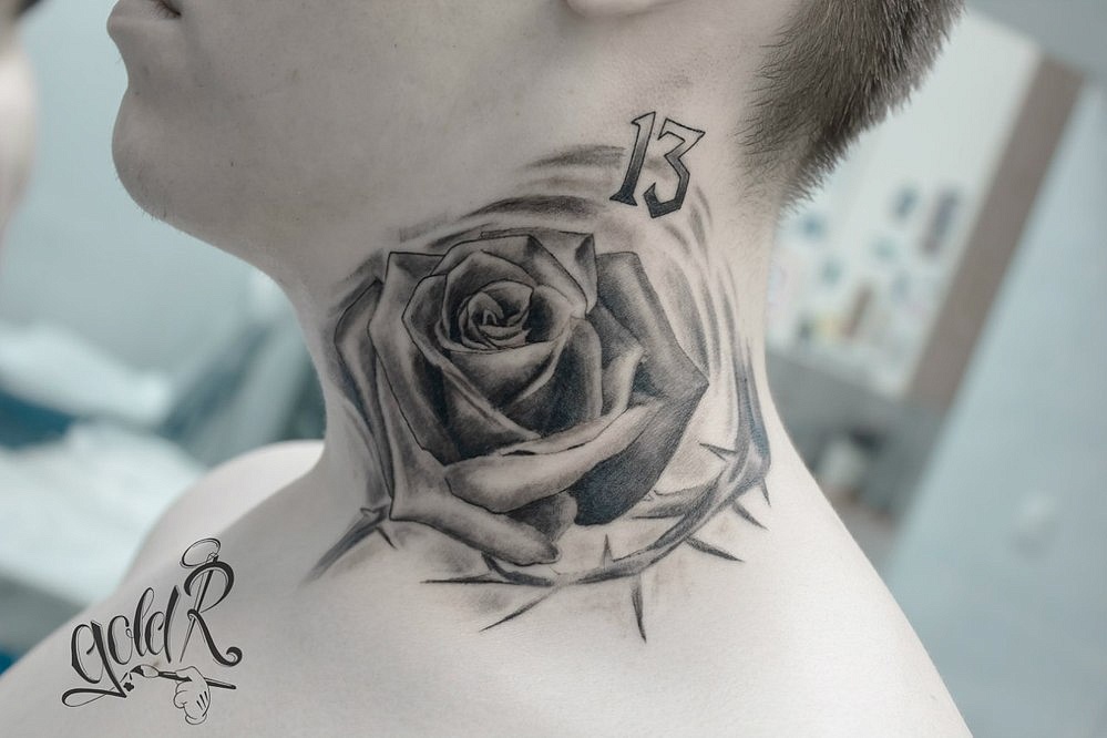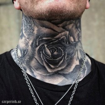 Le cou est un endroit polyvalent pour les tatouages masculins. Les grands, moyens et petits dessins auront fière allure dans ce domaine.
