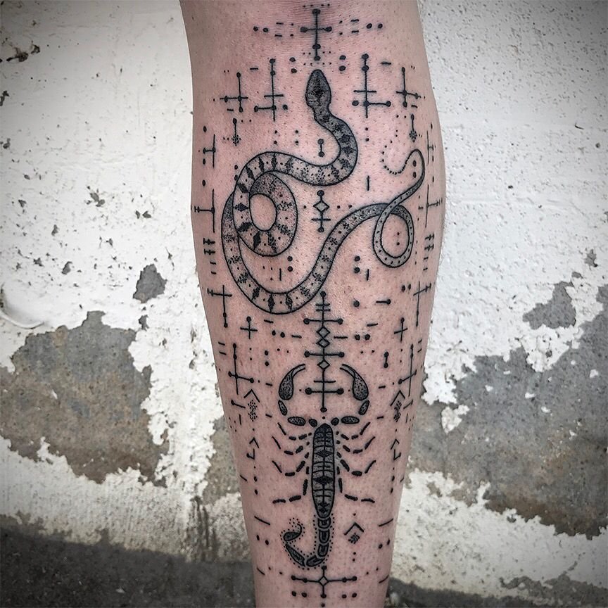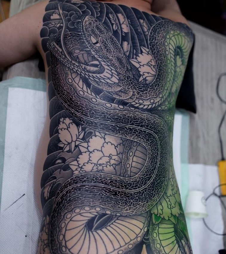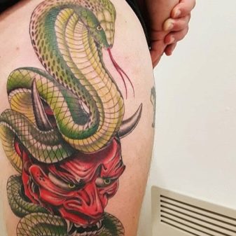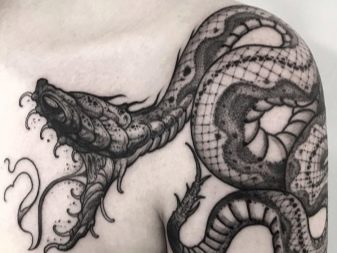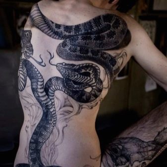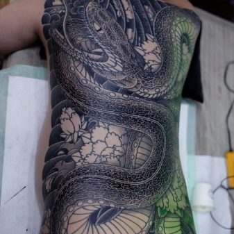 Certains clients demandent qu'un serpent avec un scorpion soit peint sur le corps. Dans le style oriental, les reptiles peuvent être représentés par paires symétriquement les uns par rapport aux autres.