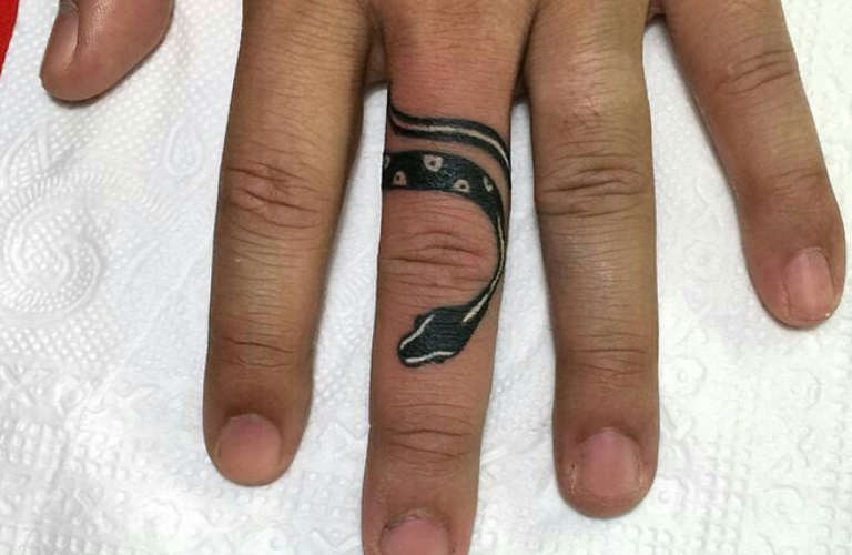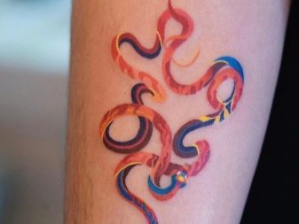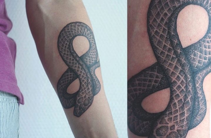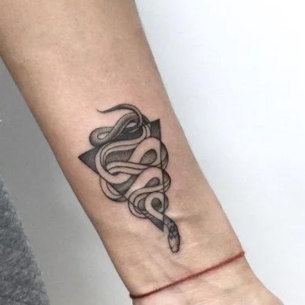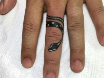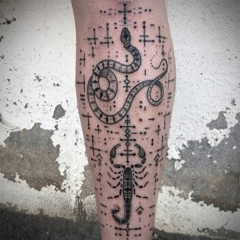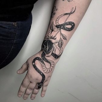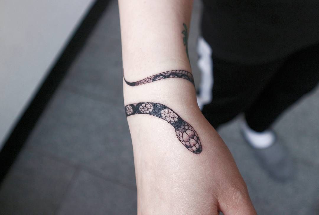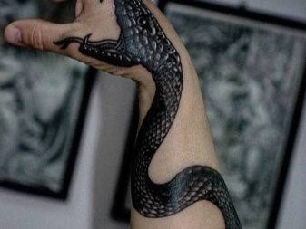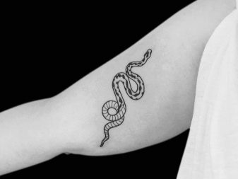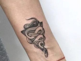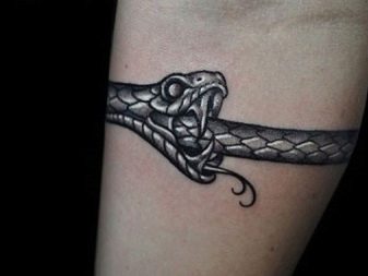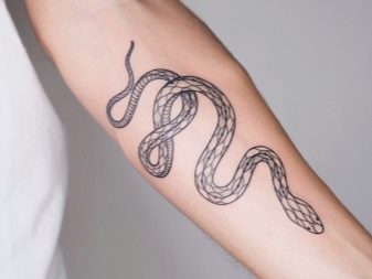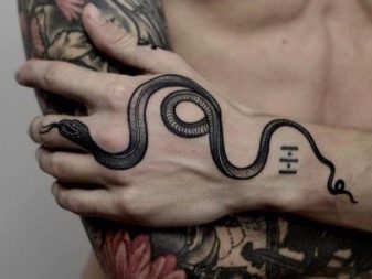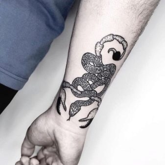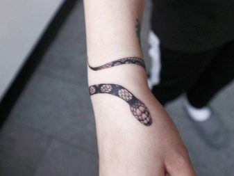 Des serpents minimalistes sont appliqués au poignet. On pense que de cette manière, le propriétaire se protège des facteurs négatifs et des méchants. Par exemple, c'est là que les signes du zodiaque et les croquis géométriques peuvent être placés.