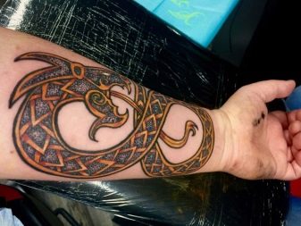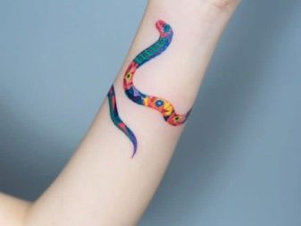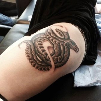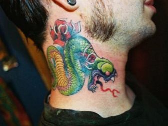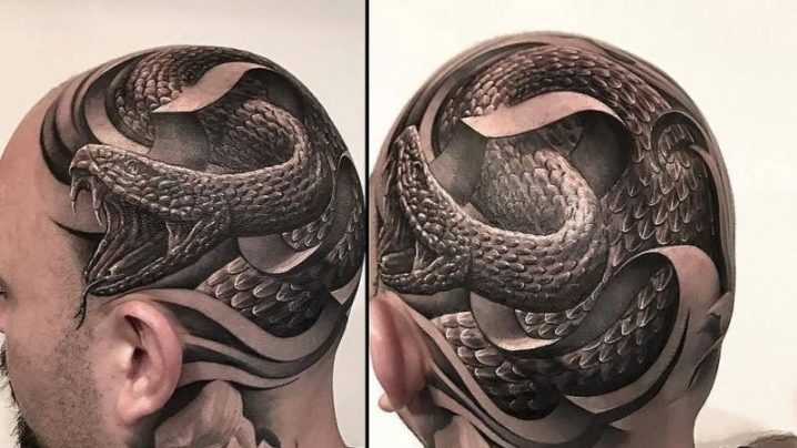 En outre, un serpent peut décorer une tête rasée. Il peut être positionné derrière l'oreille, avec la transition vers le cou et le dos.