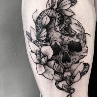 De plus, le reptile lui-même est rarement représenté sans aucun décor. Souvent, il est décoré de crânes et de toutes sortes de fleurs. Couleur d'exécution - noir.