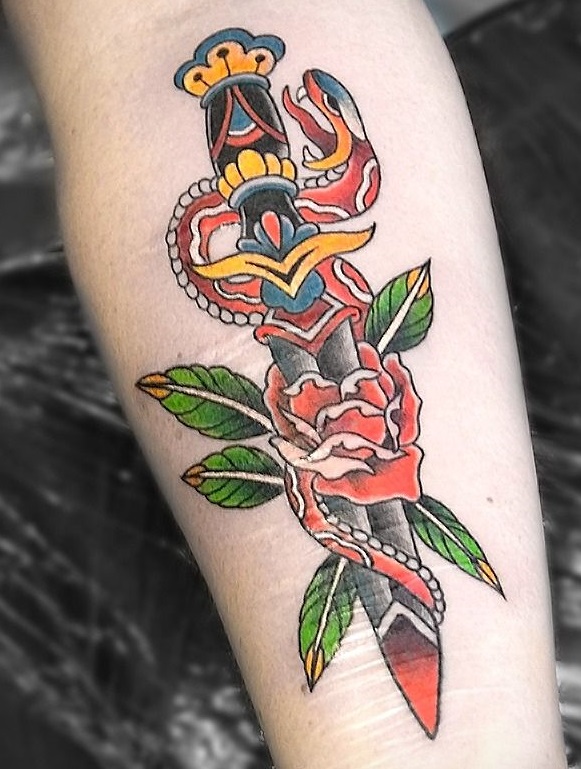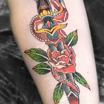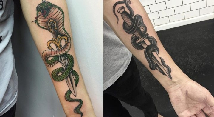 Un serpent entrelacant un poignard ou une épée peut indiquer la détermination et une certaine impénétrabilité du personnage masculin. De telles images montrent des conflits internes constants.