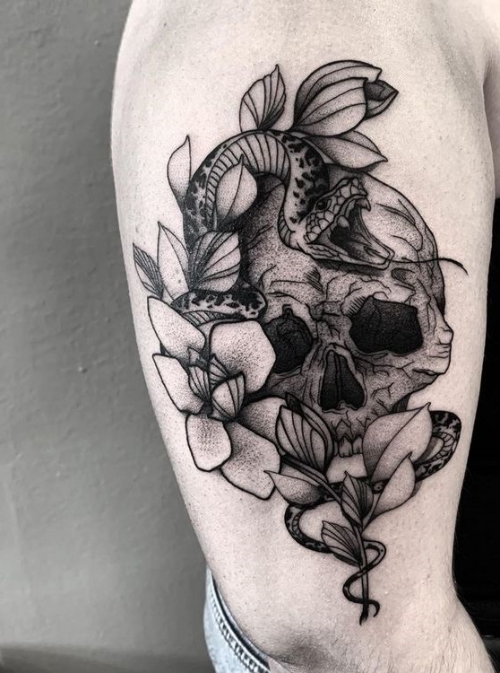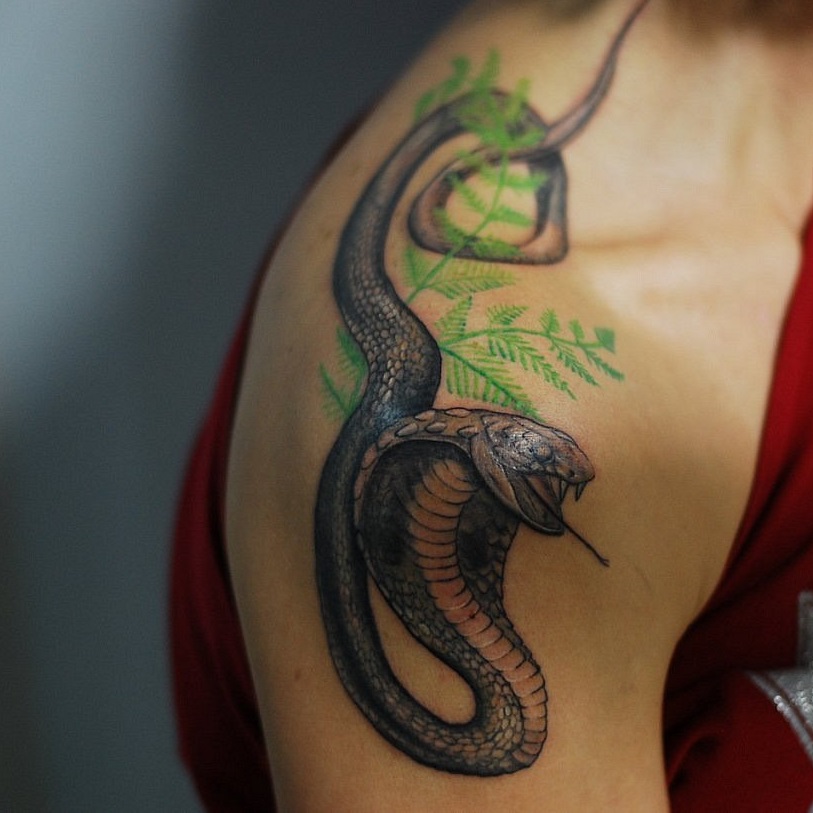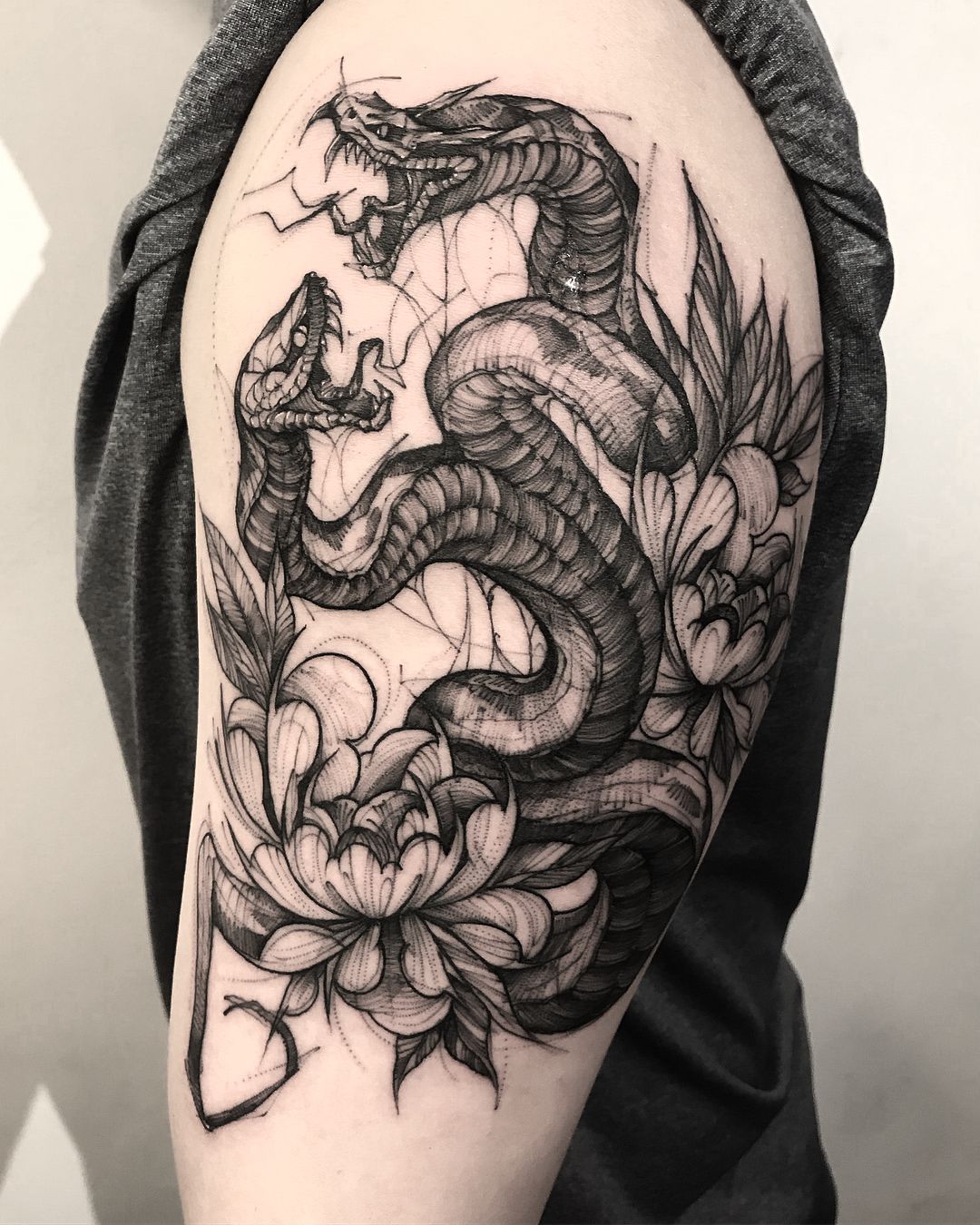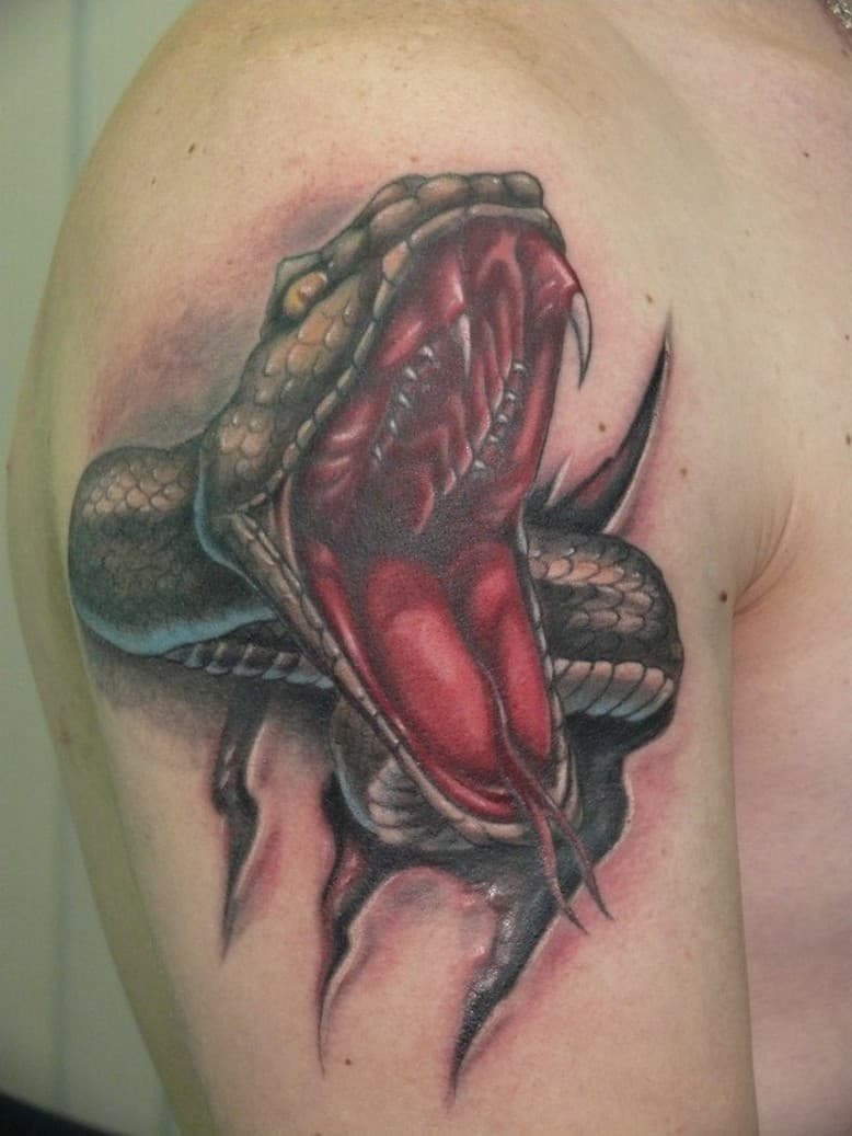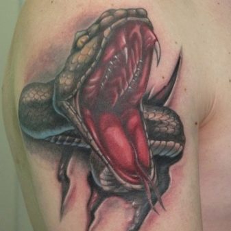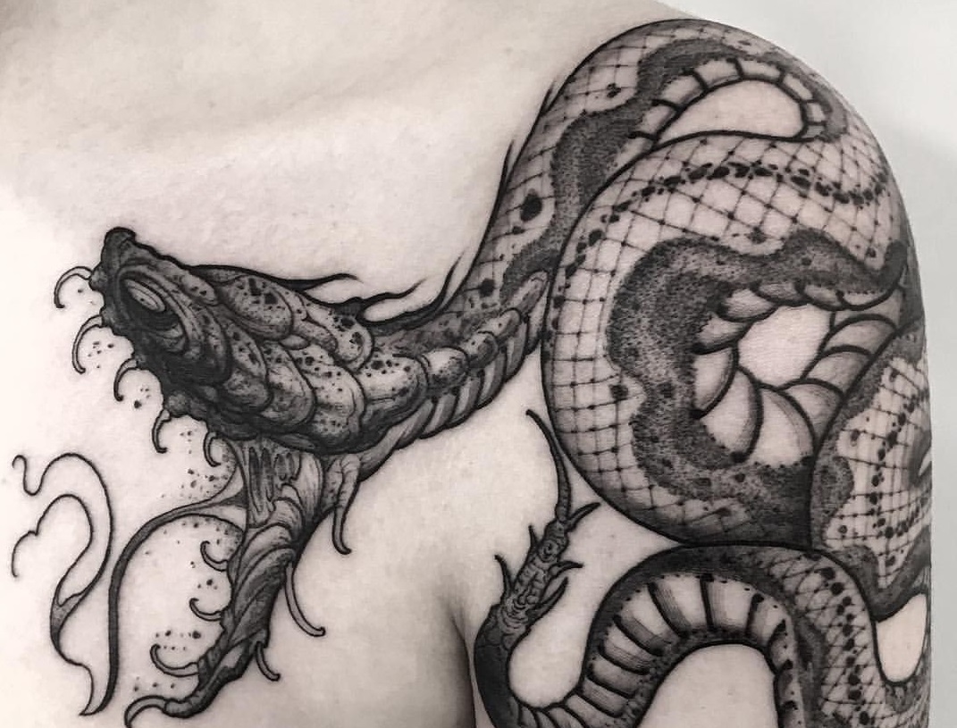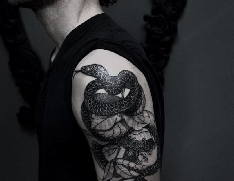 Le dessin sur le corps dépend de sa taille, de sa forme, de la technique utilisée et des préférences du client. Une épaule masculine décorée d'un tatouage de serpent démontre la masculinité et la force physique.