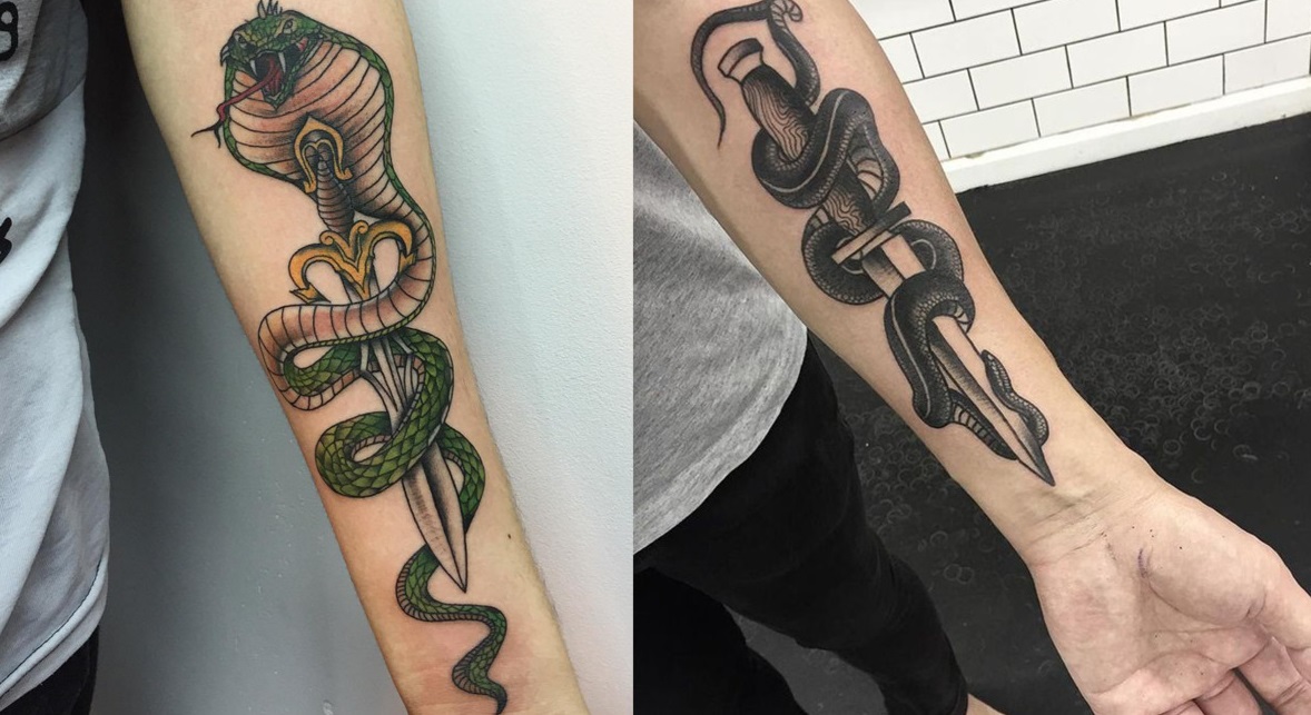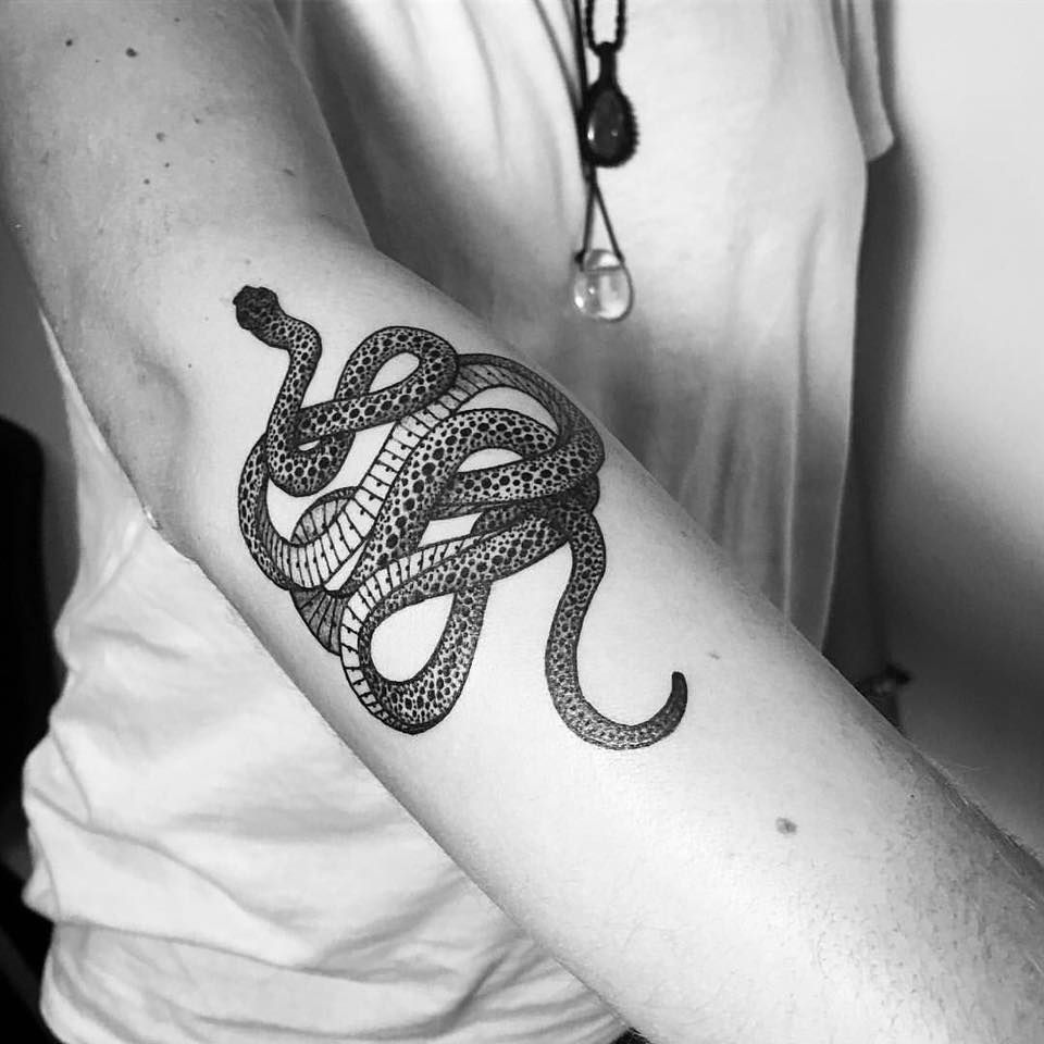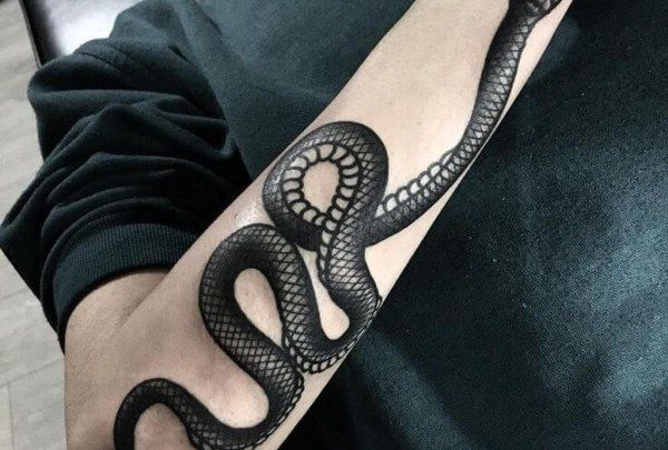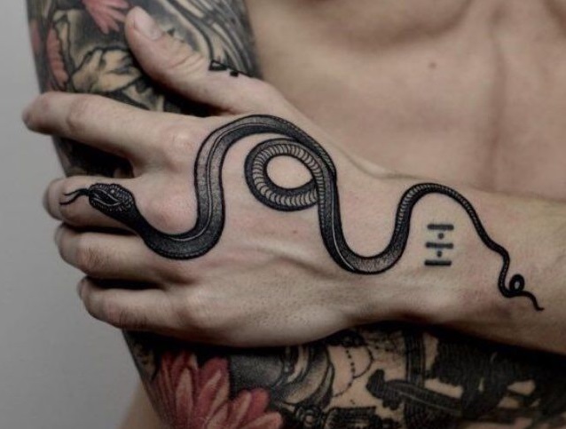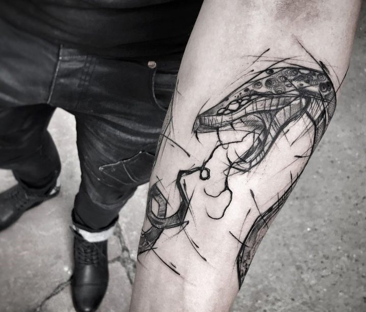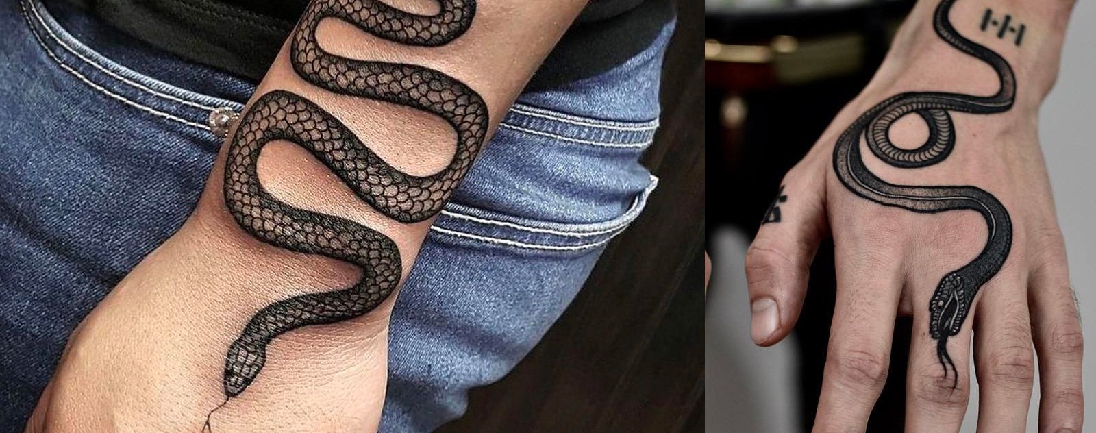 Les reptiles sont spectaculaires sur la main, enveloppant la zone du coude à la main. Les croquis dans lesquels des serpents s'enroulent autour du bras sont parmi les plus populaires de l'art corporel moderne.