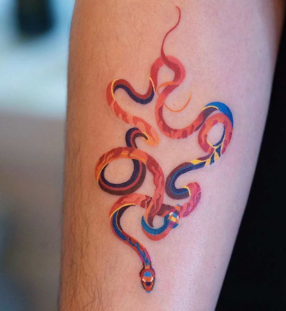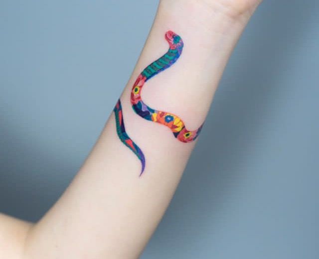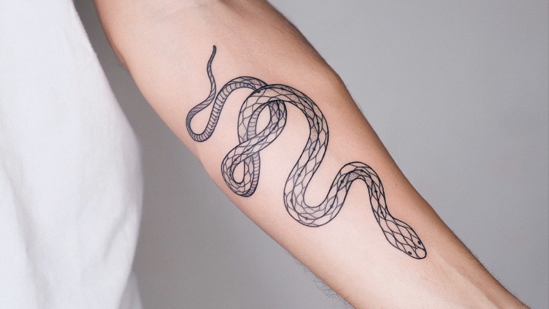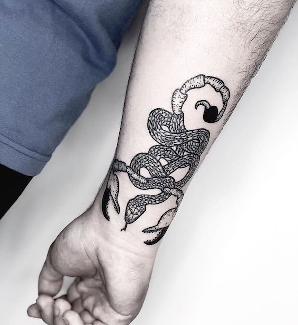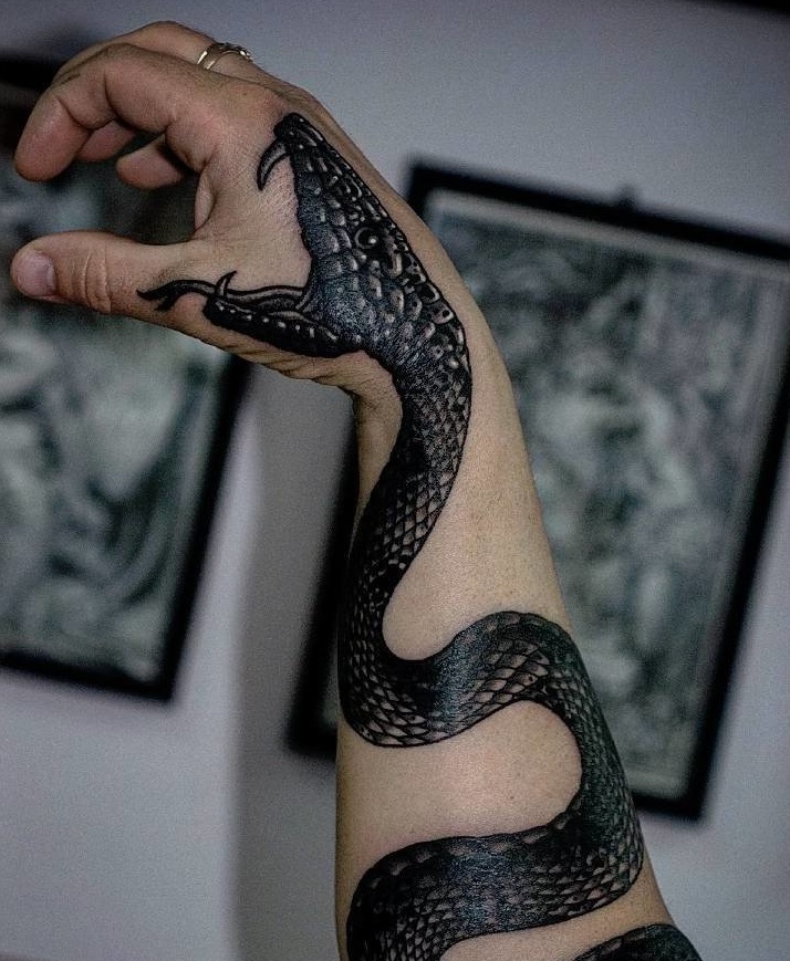 Les reptiles sont spectaculaires sur la main, enveloppant la zone du coude à la main. Les croquis dans lesquels des serpents s'enroulent autour du bras sont parmi les plus populaires de l'art corporel moderne.