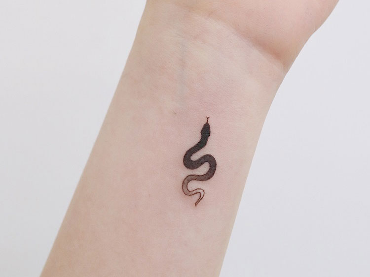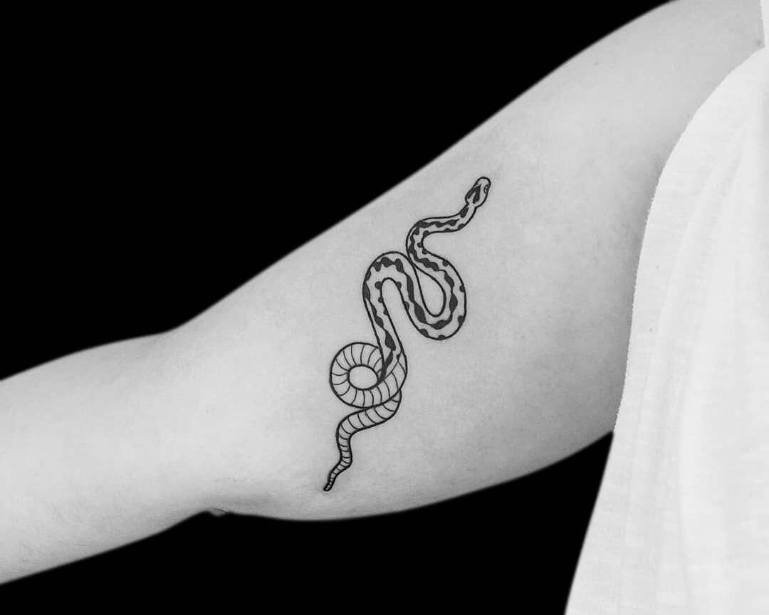 Les tatouages de serpent pour hommes, réalisés de manière minimaliste, sont de petite taille. Ce sont des images iconiques, appliquées sans trop de dessin, principalement à l'encre noire.