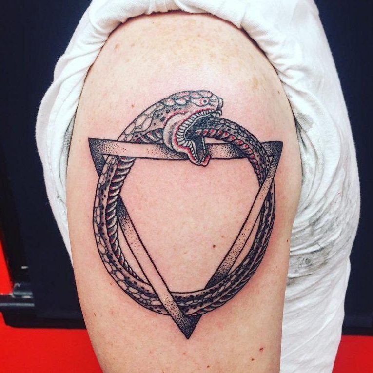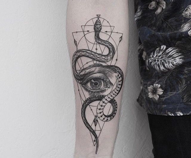 Les tatouages de serpent géométriques pour hommes sont le plus souvent combinés avec des graphiques. Contrairement à d'autres styles, ces images sont principalement remplies de noir.
