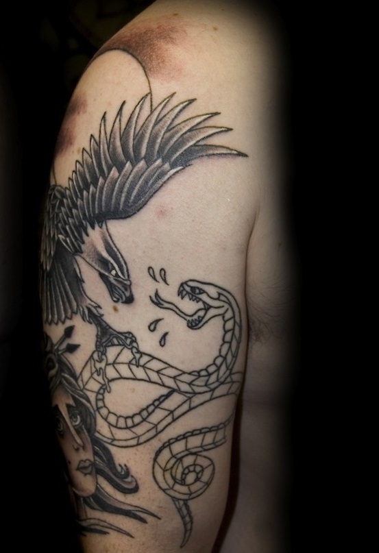 De telles images sont appliquées au corps athlétique. Un reptile sur l'épaule à droite signifie la poursuite du respect des principes de la vie.L'emplacement sur la gauche peut faire allusion au secret du personnage.