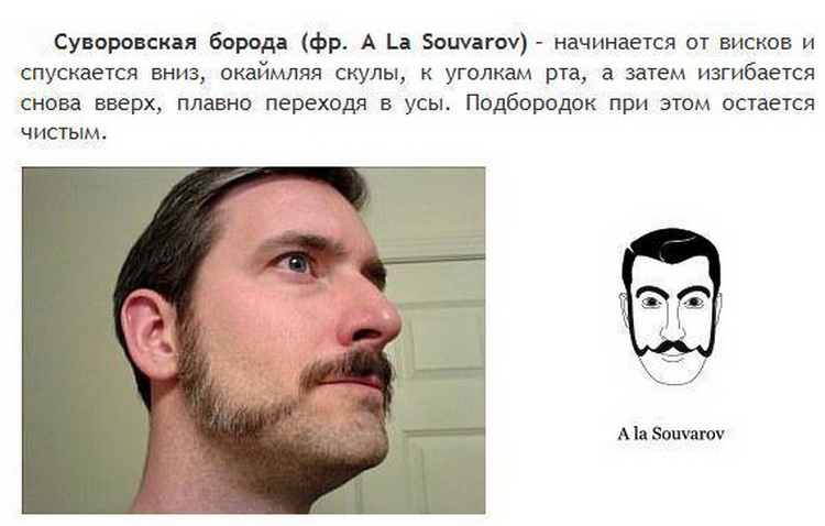 - "Suvorov" favorileri. Bu durumda, bıyıklara düzgün bir şekilde akan ince "tanklar" hakkında konuşuyoruz. Üst dudak boyunca tapınaktan tapınağa uzanan saç çizgisi yırtılmamalıdır. Kısa "tanklar" için başka bir isim "ön".
