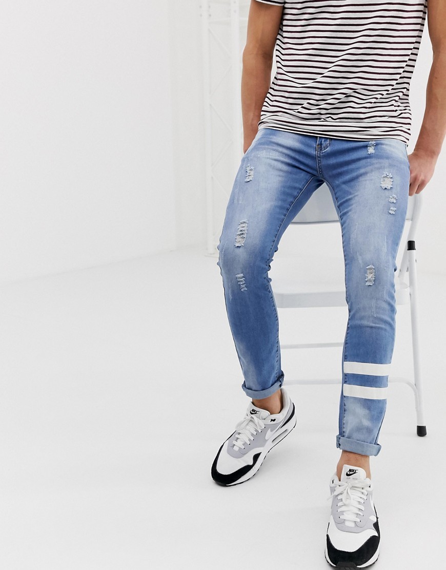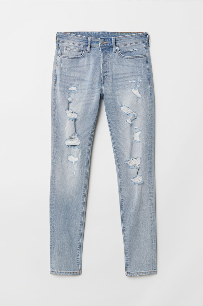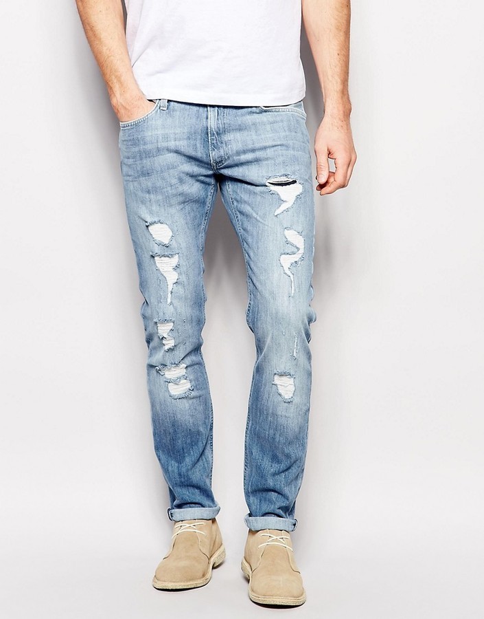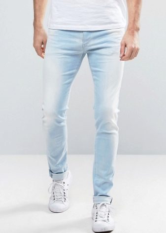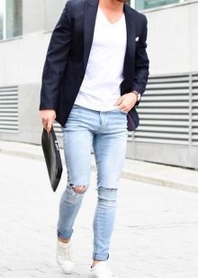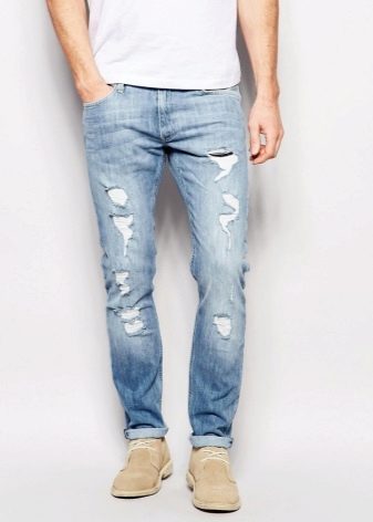 - Beyaz ve mavi. En hafif, solmuş kot pantolonlar, özellikle etkileyici dekora sahip yaz aylarında çok popülerdir: kesikler, çizikler. Parlak ve açık renkli giysilerle iyi geçin.
