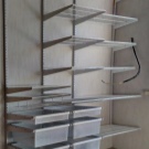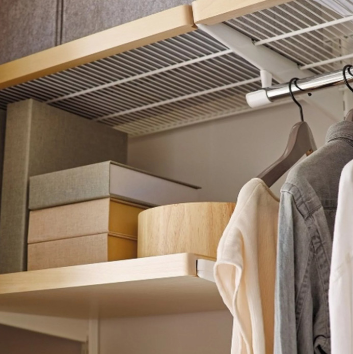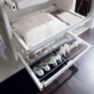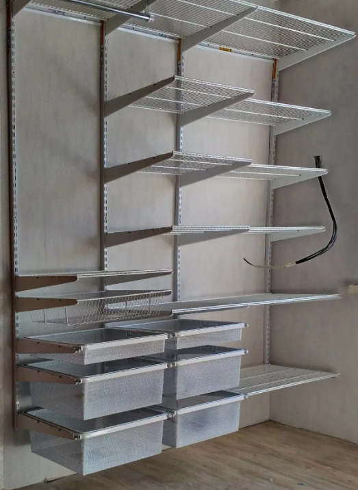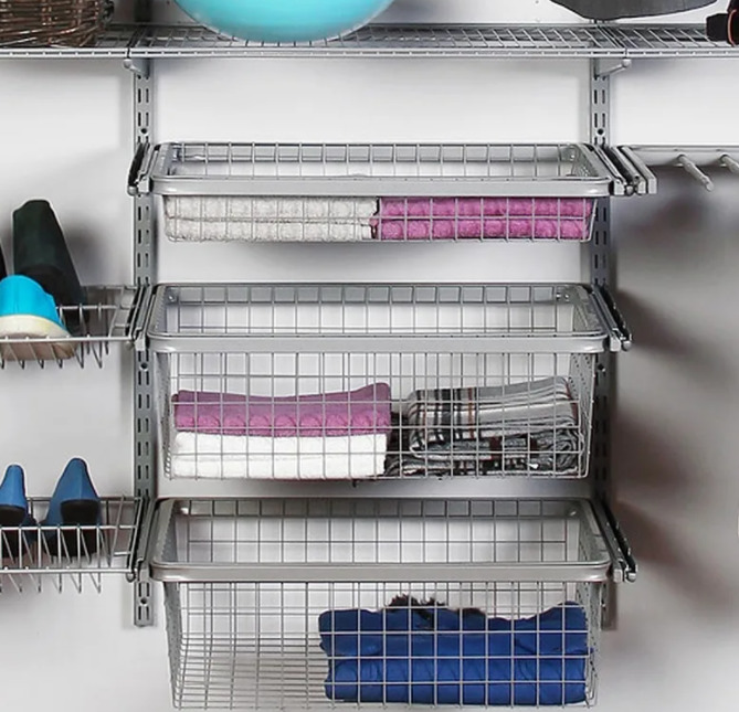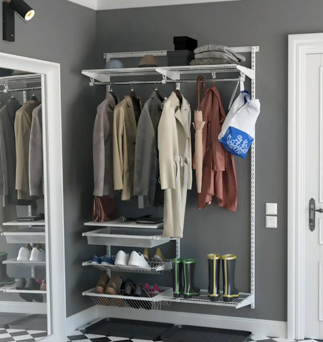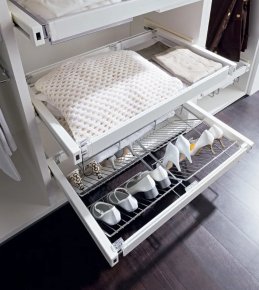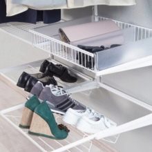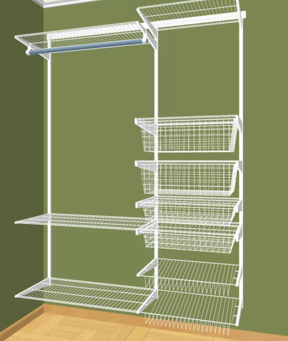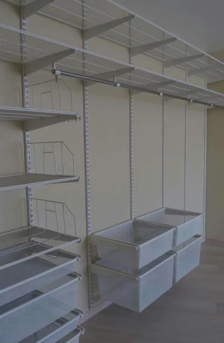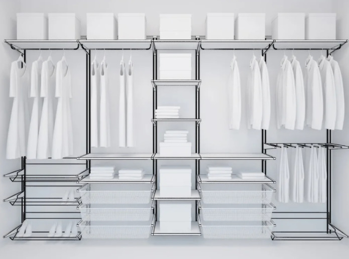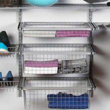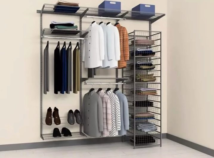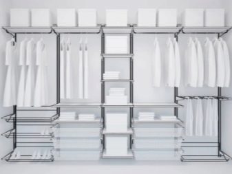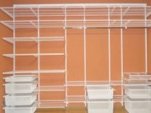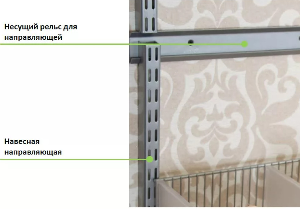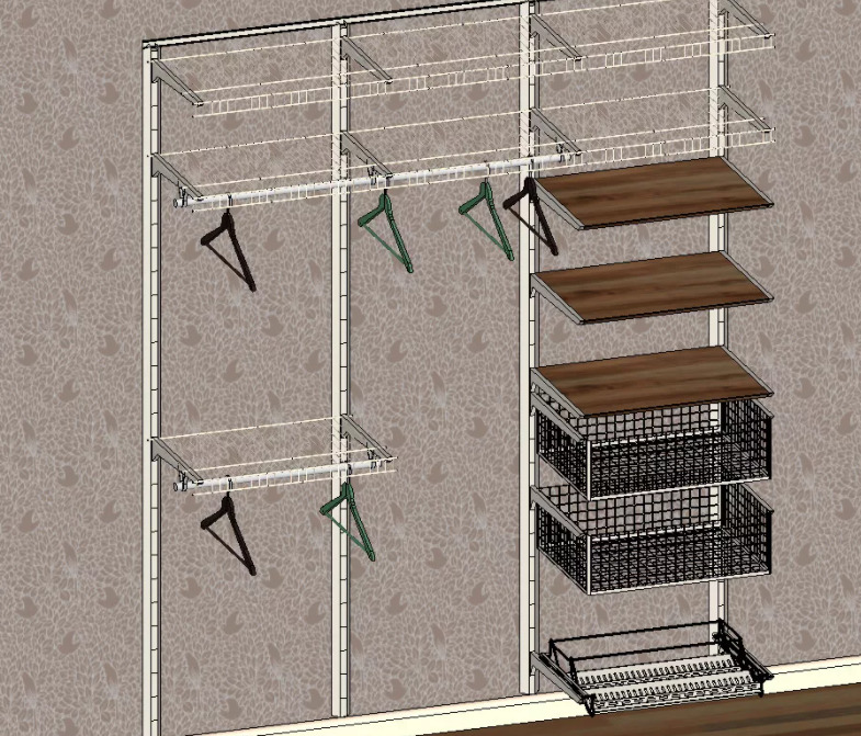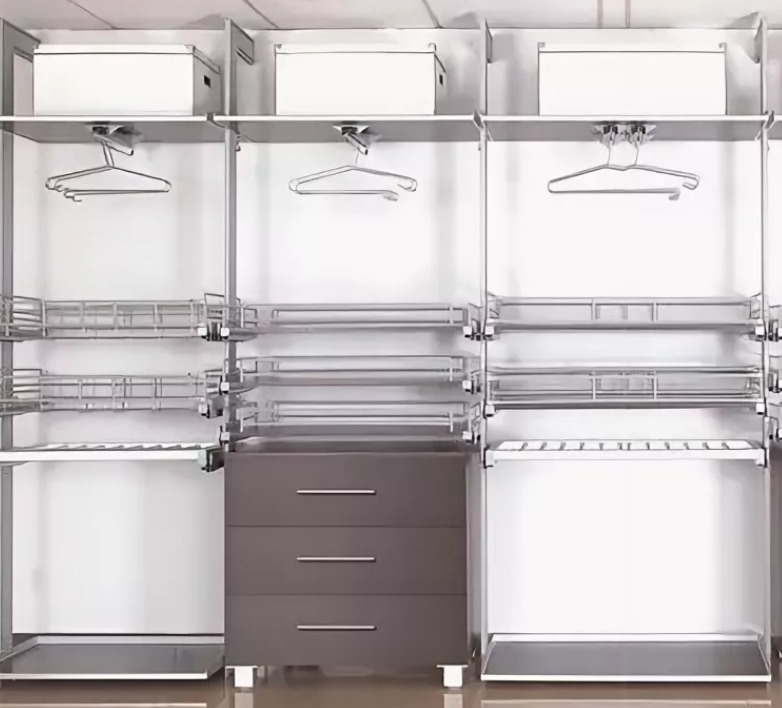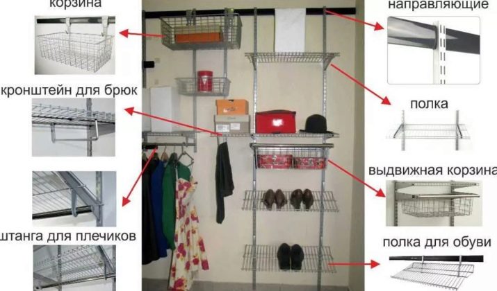 - İçerik öğeleri. Bu, raylar boyunca hareket eden örgü sepetlerin yanı sıra özel kulplara bağlı süspansiyon modüllerini içerir. Ayrıca paket, ayakkabı düzenleyicileri, çeşitli giyim eşyaları için raflar içerebilir.