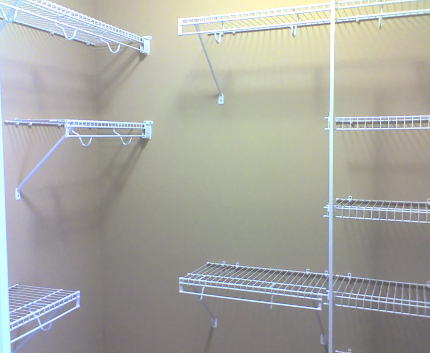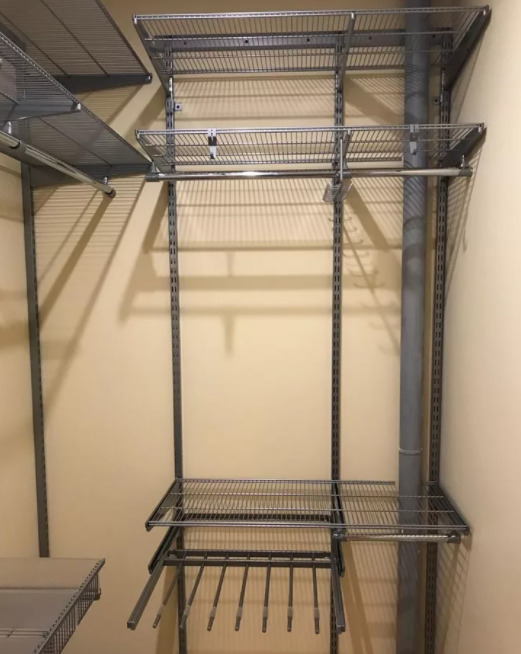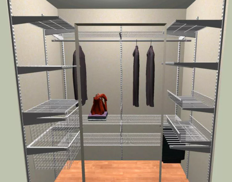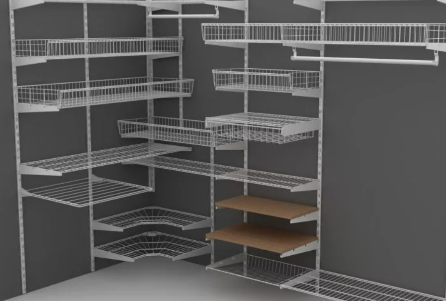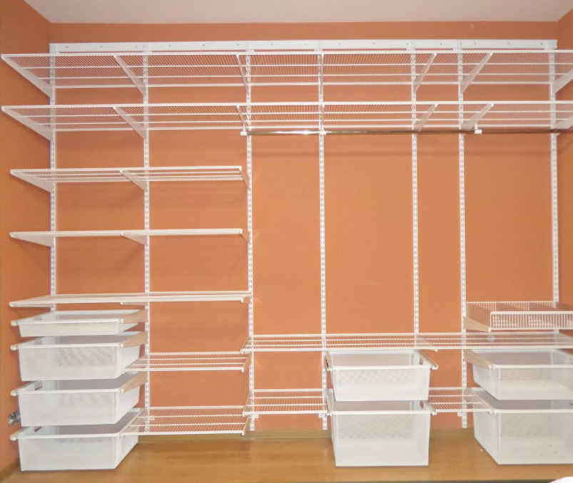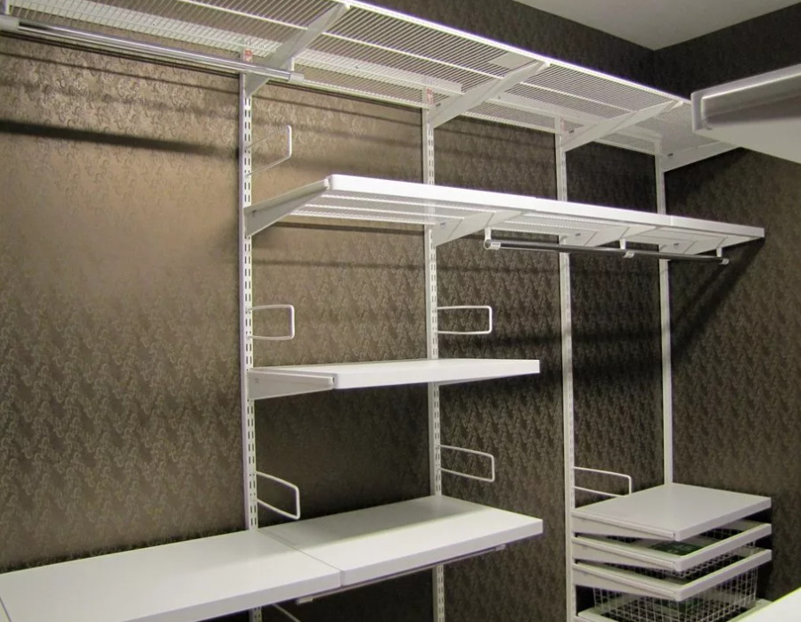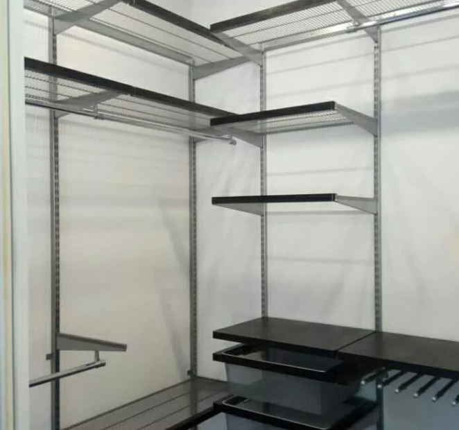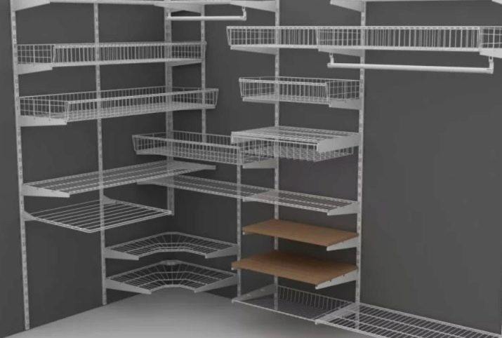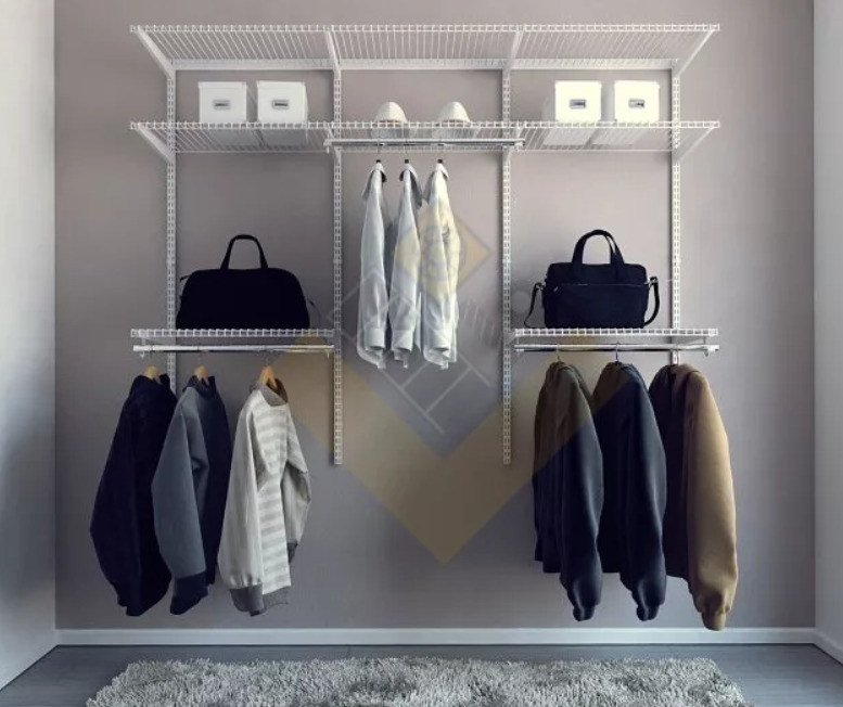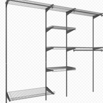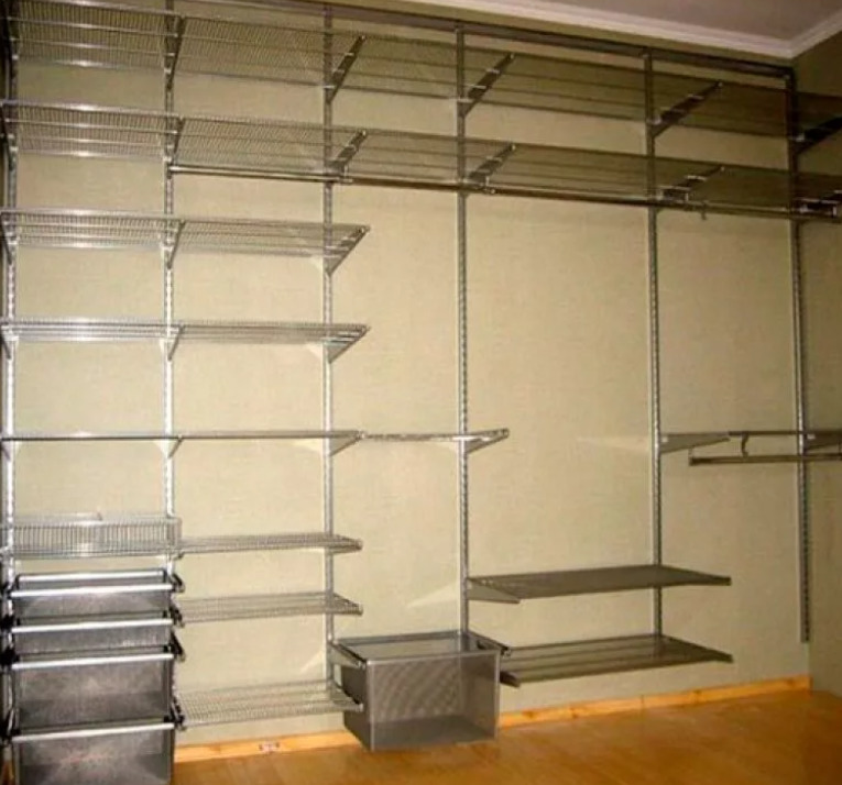 - Ara parçada kurulum ile. Bu tip ağ depolama sistemi, taban olarak kullanılarak 2 yan duvar arasına kurulur. Elemanların geri kalanı boş olarak monte edilmiştir.Bu tür giyinme odalarının estetiği azalır, ancak daha güvenilir olarak kabul edilir ve önemli operasyonel yüklere dayanabilir.