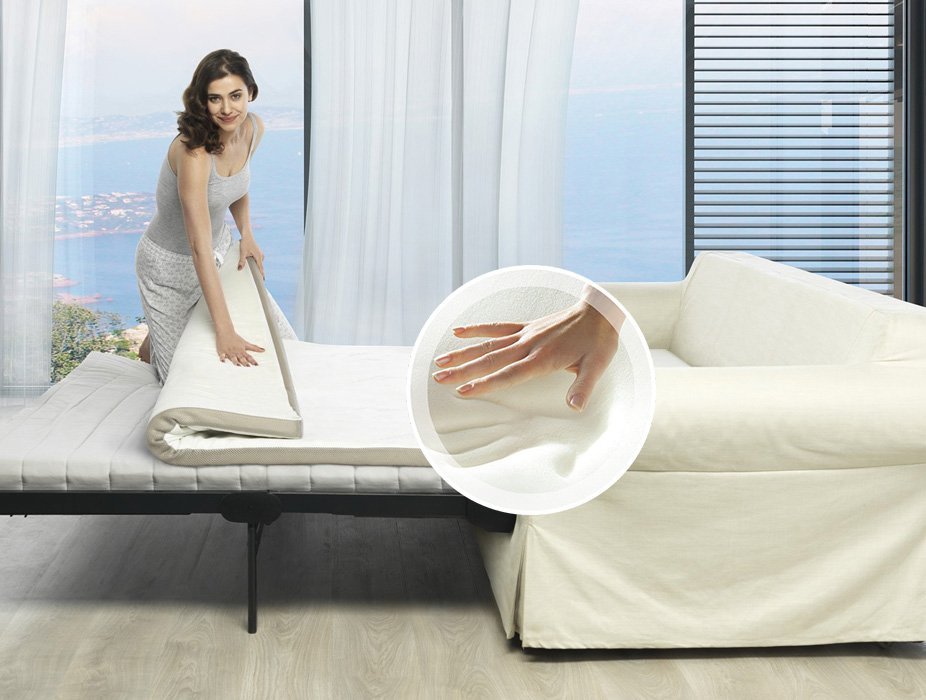 Modüler ve kayar elemanlar arasındaki farkların ortadan kaldırılması. Kanepede uyumayı en çok rahatsız eden onlardır. Topper yerindeyken, kitap kanepelerinde ve katlanır yataklarda sorunlu alanları düzeltebilirsiniz.