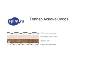 - Cocos Askona - yüksek sertlik. Dolgu maddesi hindistan cevizi hindistan cevizidir. Omurga hastalıklarının oluşumunu mükemmel şekilde önler. Yükseklik - 5 cm Coira kokusuzdur ve antibakteriyel özelliklere sahiptir. Ürün, farklı sertlik derecelerine sahip çift taraflıdır. Kilitli çıkarılabilir jarse kılıf. Sabitleme cihazları vardır. Aşınmaya dayanıklı. Maliyet - 5700-11300 ruble.