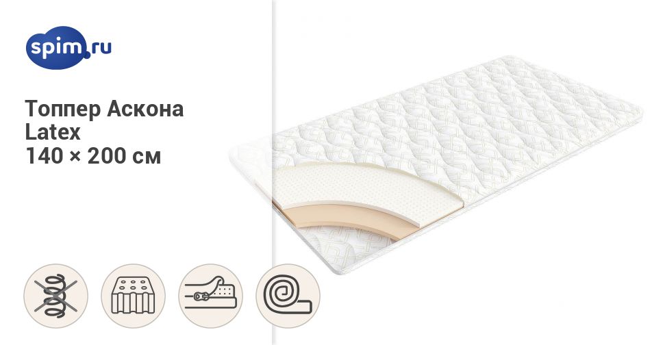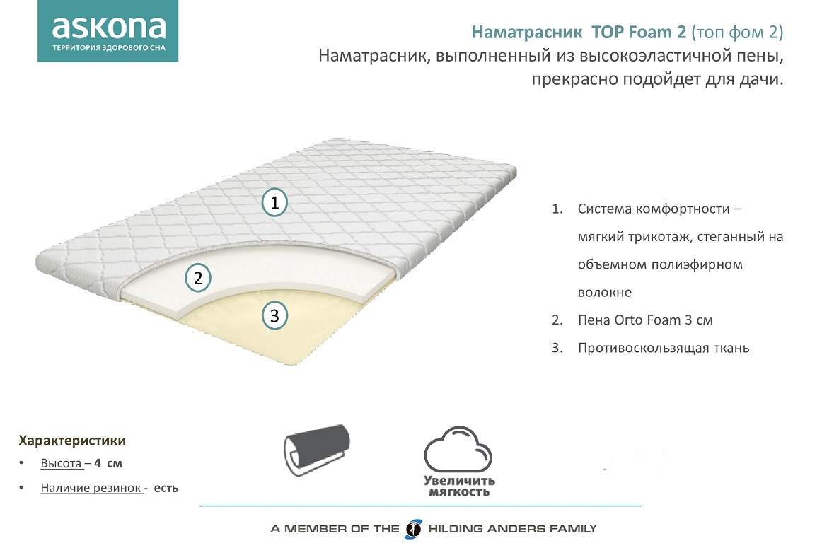- TOP Askona 1 - birinci sınıf çevre dostu bir ürün, doğal lateks ve ergonomik yapıya sahip OrtoFoam dolgulu. Yatakta uyumak için ideal. Hipoalerjenik bileşenli yüksek kaliteli jarseden yapılmış çıkarılabilir olmayan kılıf. Güvenli tutucularla donatılmıştır. Yükseklik - 5 cm Rulo halinde saklanır. Fiyat - 10000-18800 ruble.