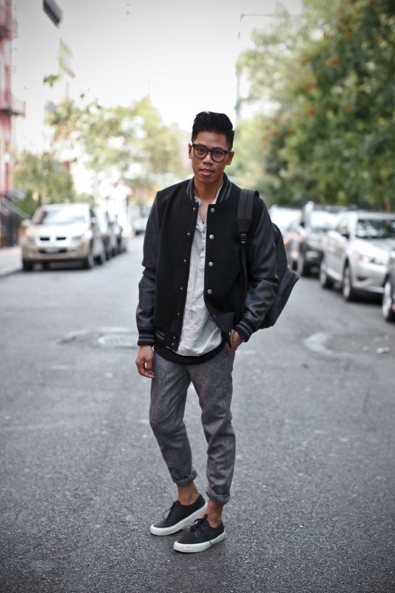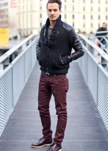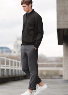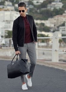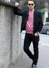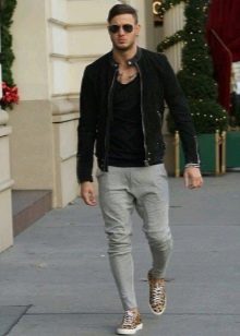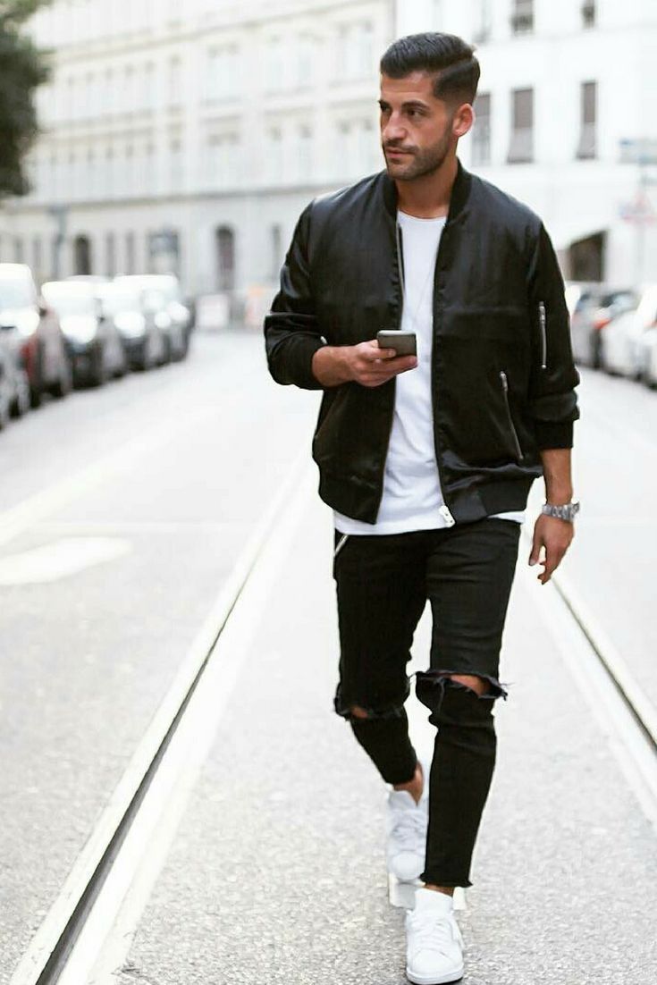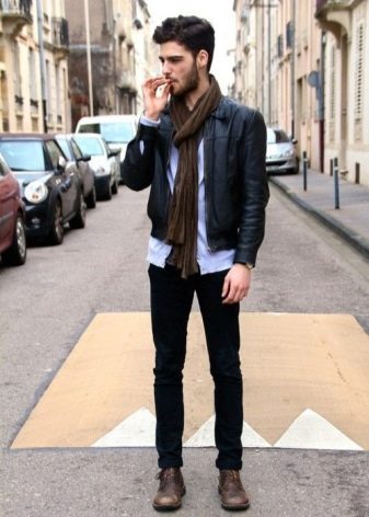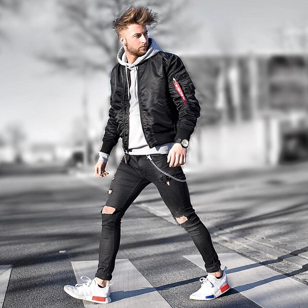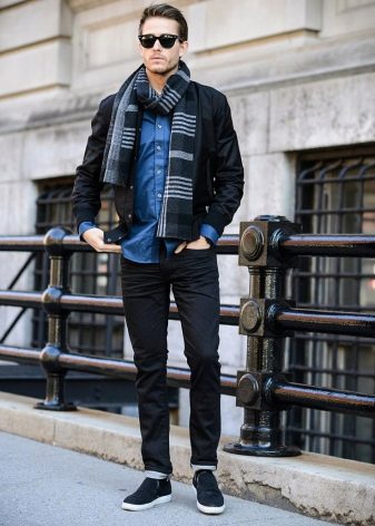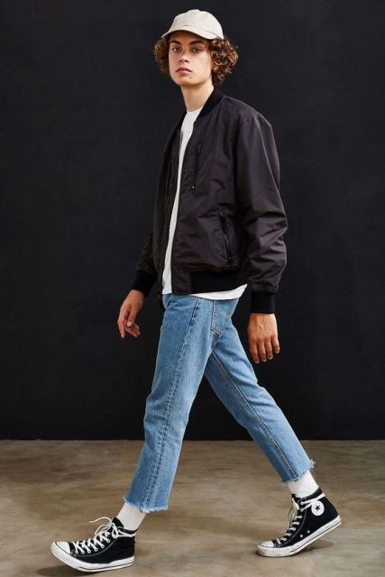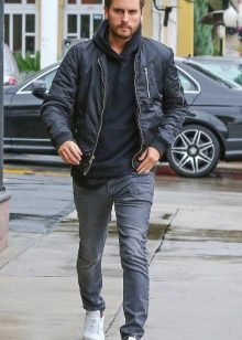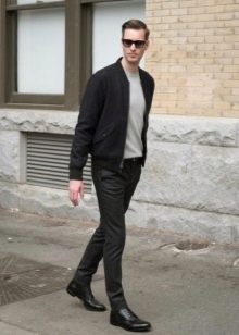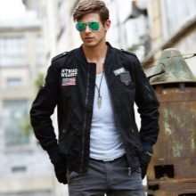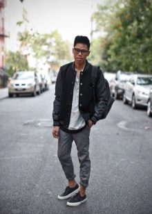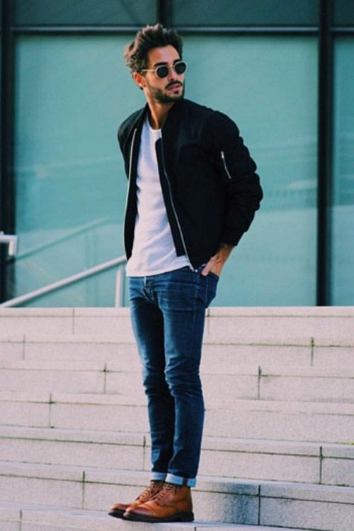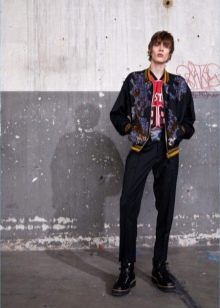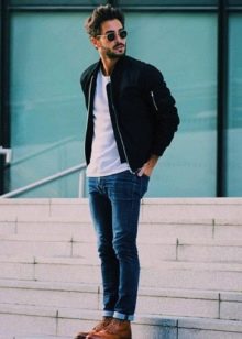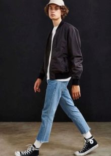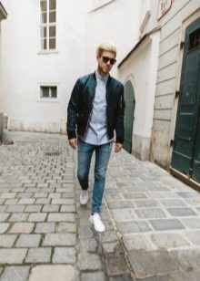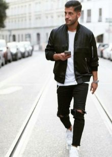 Genç erkekler için, skinny jean pantolonlarla birlikte bir bomber ceketin giyildiği bir tarz harika. Kesik ve çiziklere sahip etkileyici modeller, görüntüye mükemmel uyum sağlar. Cekete gelince, burada hafif ve su geçirmez malzemelerden yapılmış bir bomber ceket uygundur. Görüntüyü uzun, açık renkli bir tişörtle tamamlamak en iyisidir.