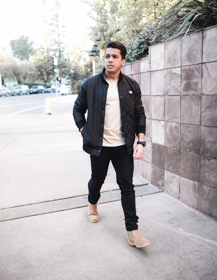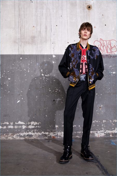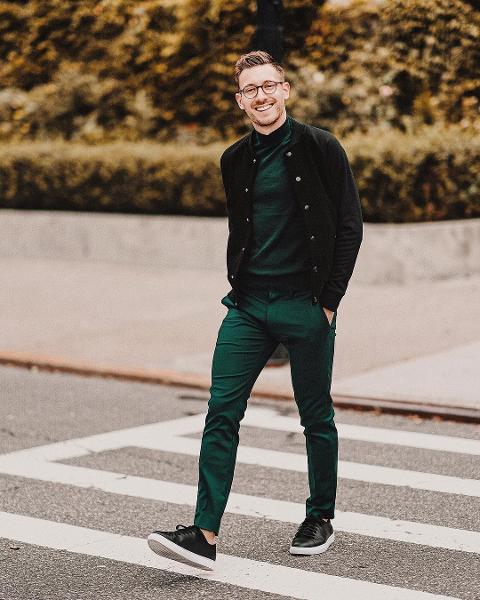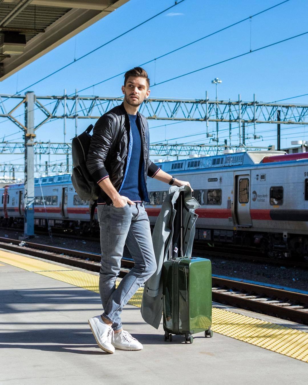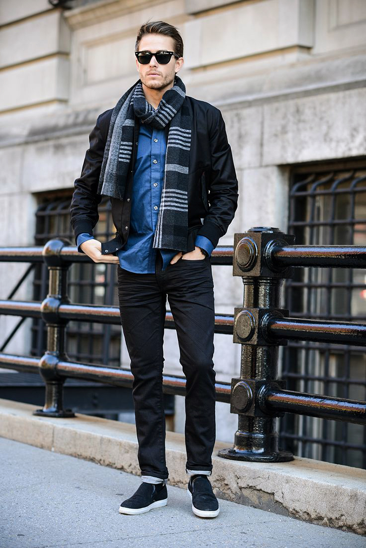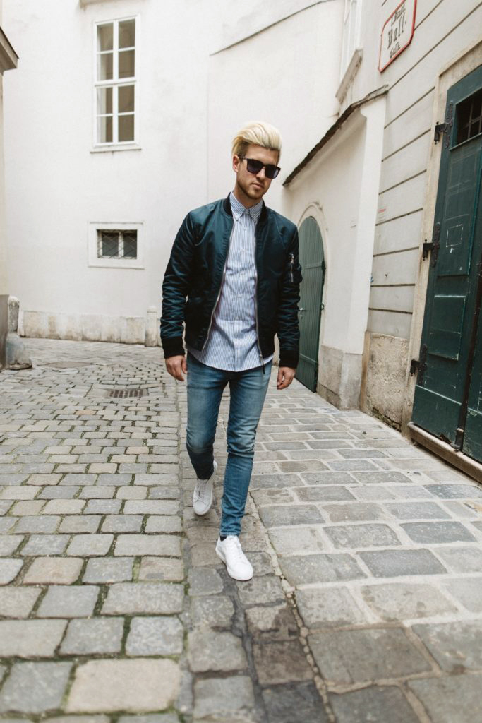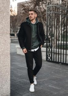 Genç erkekler için, skinny jean pantolonlarla birlikte bir bomber ceketin giyildiği bir tarz harika. Kesik ve çiziklere sahip etkileyici modeller, görüntüye mükemmel uyum sağlar. Cekete gelince, burada hafif ve su geçirmez malzemelerden yapılmış bir bomber ceket uygundur. Görüntüyü uzun, açık renkli bir tişörtle tamamlamak en iyisidir.