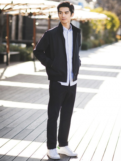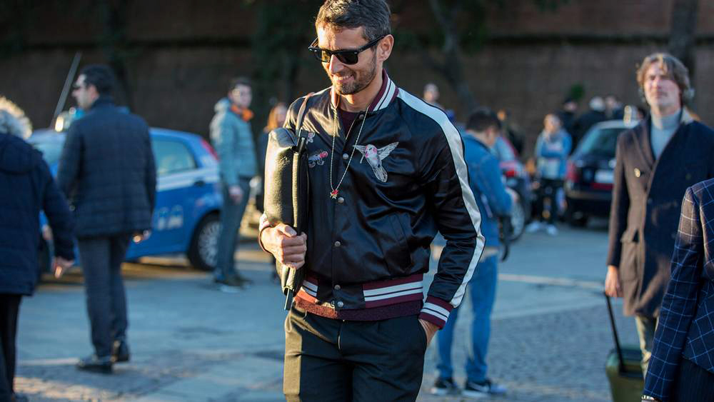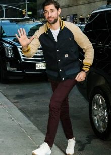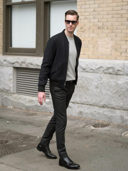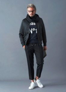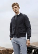 Bomber ceket ile şehirli bir görünüm, koyu renklerde düz pantolon ve klasik bir gömlekten oluşuyor. İkinci eleman sıkışmış değil, pantolonun üzerinden tamamen serbest bırakılmıştır. Kadife, süet veya kottan yapılmış ceketlerin tercih edilmesi önerilir.