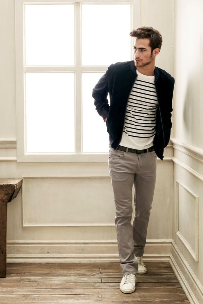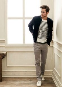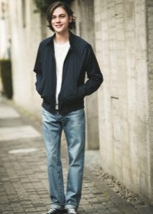 Genç erkekler için popüler bir ceketin mavi kot pantolon ve açık renklerde herhangi bir gömleğin kombinasyonu harika. Böyle kaygısız bir tarz, şık ve aynı zamanda rahat görünmeyi tercih edenler için uygundur. İstenirse gömlek kısmen sıkıştırılabilir veya tamamen serbest bırakılabilir. Bu görünüm için bir kot veya jarse bomber ceket idealdir. Bir süet ceket de uygun görünecek.
