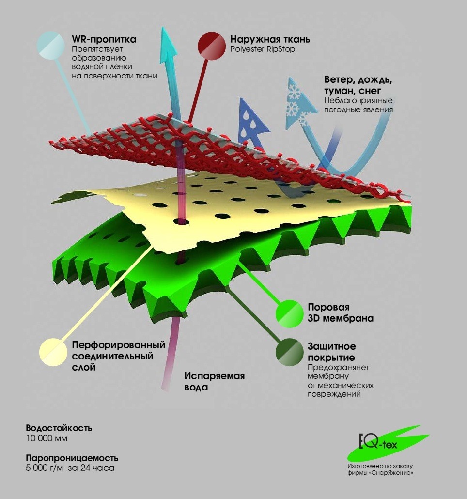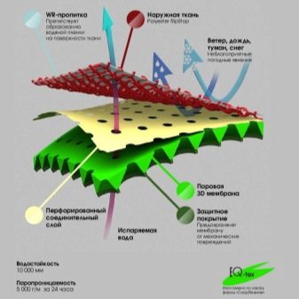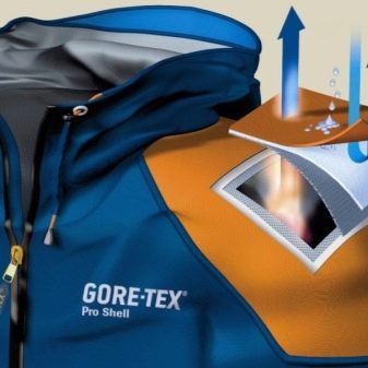 - Politetrafloroetilen (PTFE işaretleme) veya poliüretan (PU) film ile laminasyon yöntemi. Gelişmiş membran üreticileri, gerilmiş politetrafloroetileni tercih eder. ePTFE giysiler elastiktir ve aktif sporlar için daha uygundur.