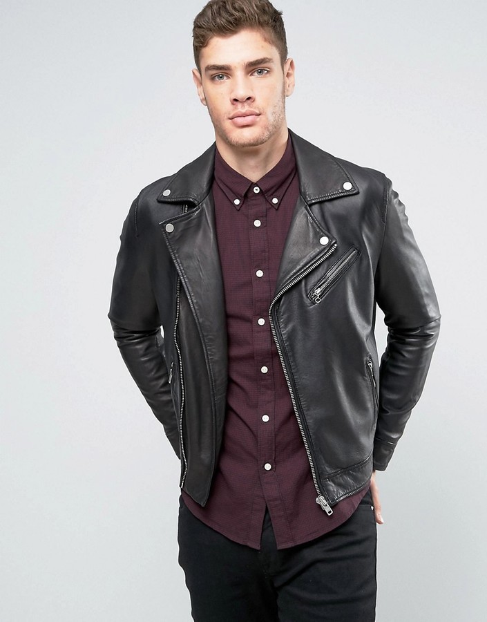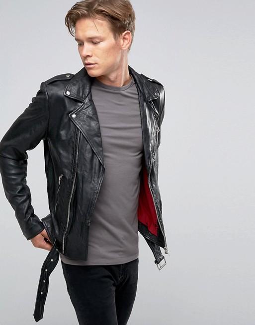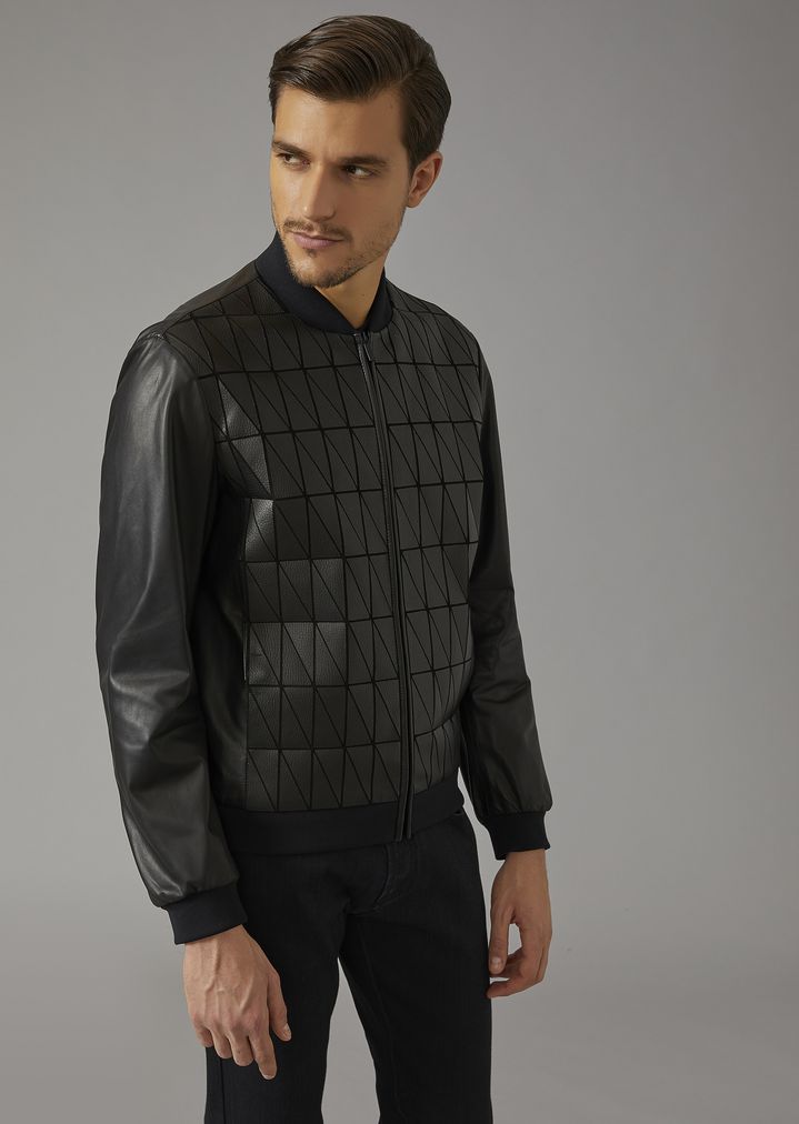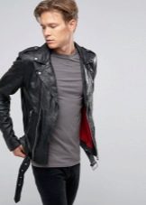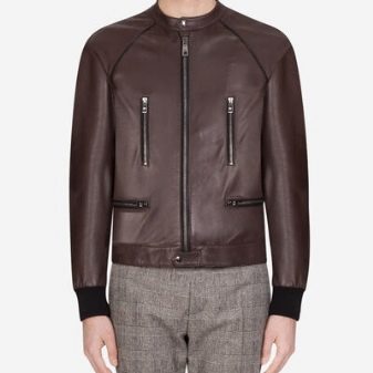 Armani'nin deri bisikletçileri, fermuarlarla süslenmiş ve dik yaka ile tamamlanan mat siyah deriden yapılmıştır.