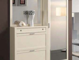 Şu anda piyasada söz konusu ürünlerin birçok çeşidi bulunmaktadır. Çekmeceler, ayakkabı bölmeleri, asma raflar ve diğer yapısal elemanlarla donatılabilirler. Ayrıca dikkat çekici olan şekiller - dikdörtgen ve kısaltılmış, geniş ve dar ve ayrıca farklı derinliklere sahip. Yukarıda listelenen özelliklerden bağımsız olarak, aynalı herhangi bir dolap, birleşik veya ayrı olmak üzere iki kategoriden birine bağlanabilir.
