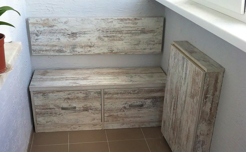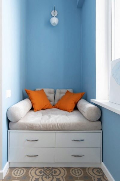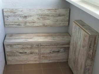 - Çekmeceli sandık böyle görünebilir. Gerekli şeyler çekmecelerde bulunur ve üst katta kanepe şeklinde rahat bir koltuk vardır. Balkonda bir şeyler yerleştirmek ve dinlenmek için harika bir seçenek.