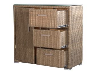 Beyaz yüksek şifonyer kapılar ve çekmeceler ile herhangi bir balkon tasarımına sığacak ve birçok şeyi saklamanıza izin verecektir.