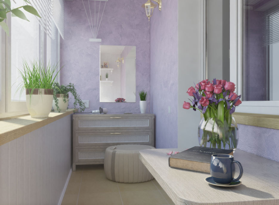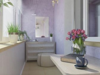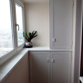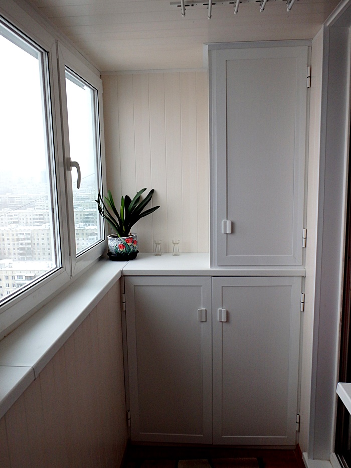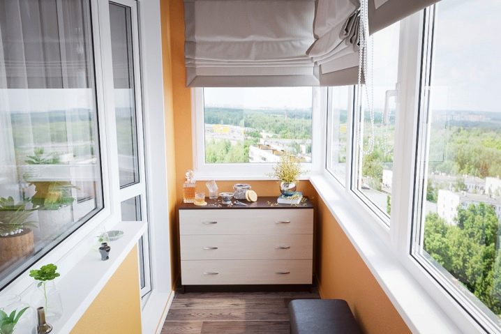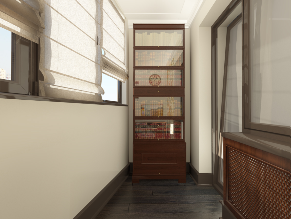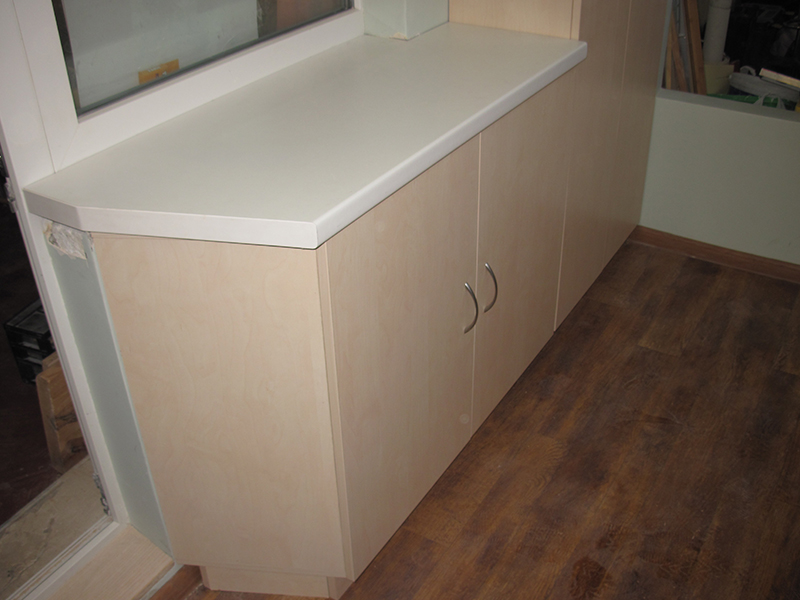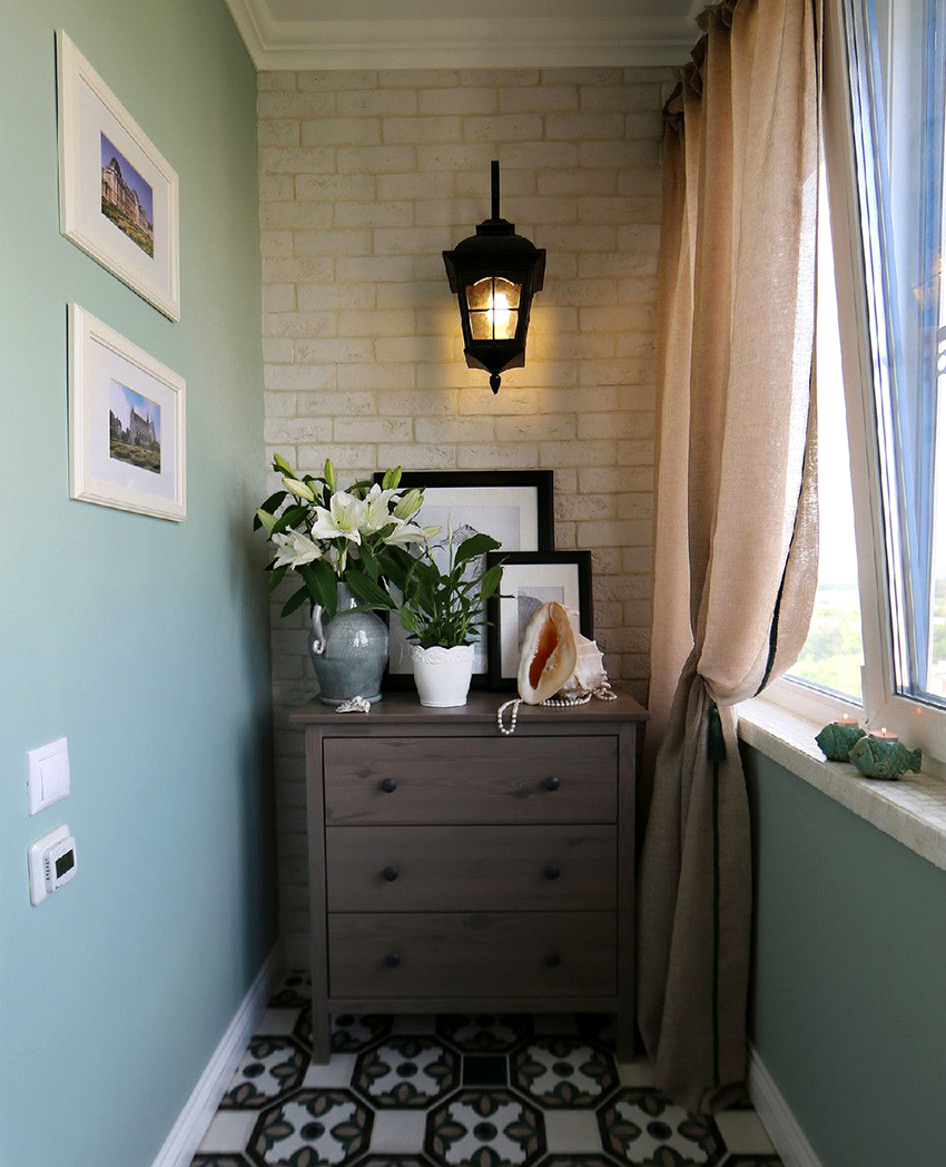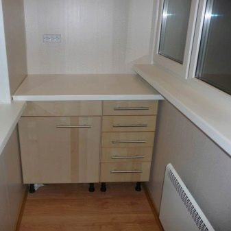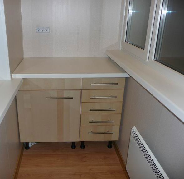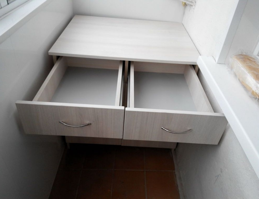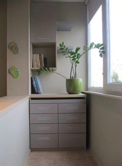 Pencerenin altına (hem iç mekan hem de balkon) birkaç sıra çekmeceli uzun bir alçak versiyon yerleştirilebilir. Pencerenin altında iyi görünecek. Çekmeceler gerekli şeyleri barındıracak ve şifonyerin üzerine iç mekan çiçekleri koyabilir veya yüzeyi çay içmek için masa olarak kullanabilir, aynı alçak sandalyeleri toplayabilirsiniz.