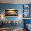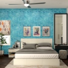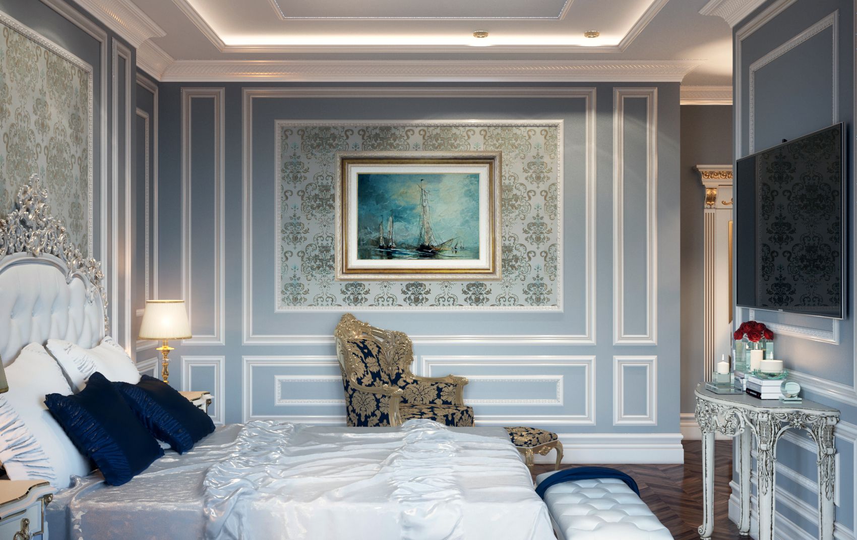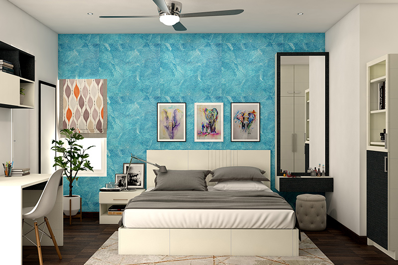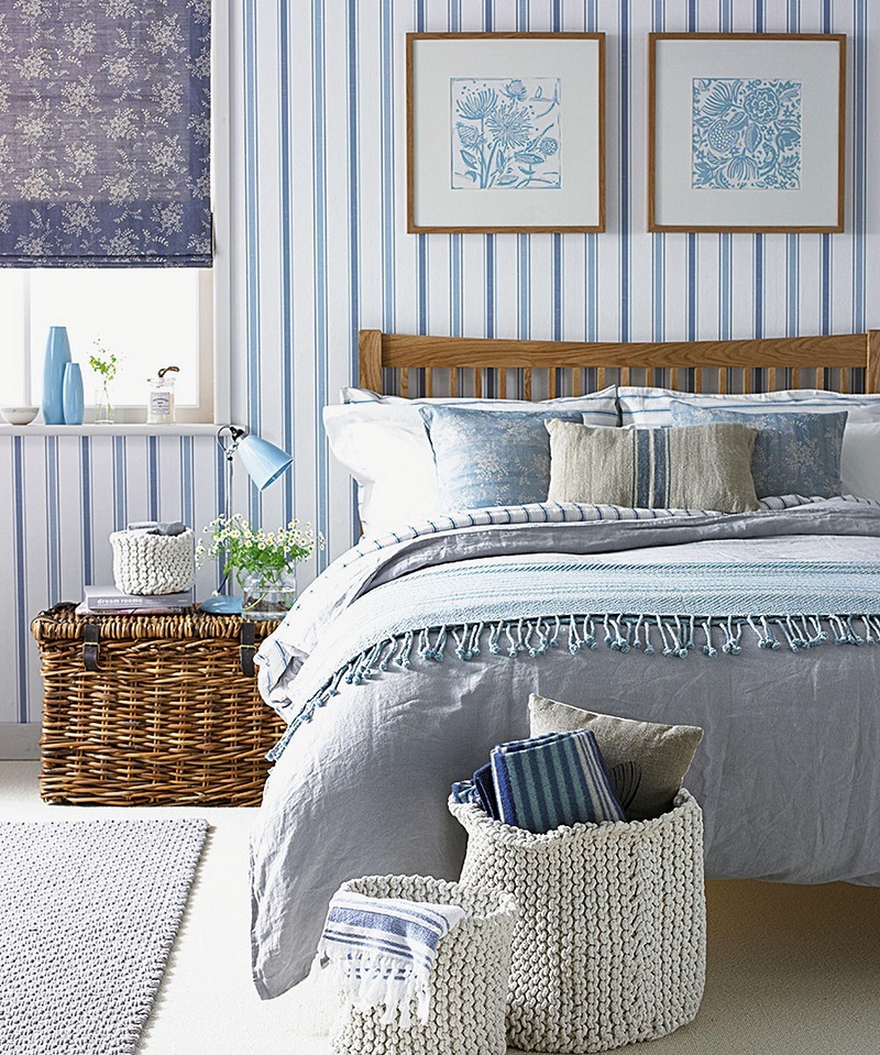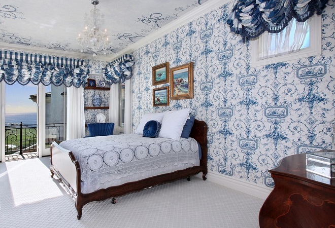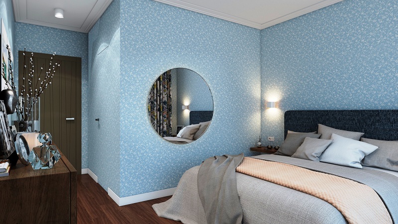 Yatak odasının iç kısmındaki mavi duvar kağıdı