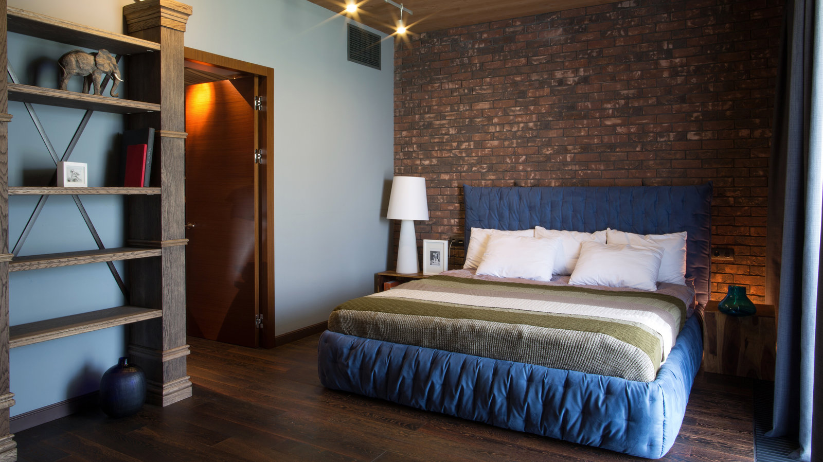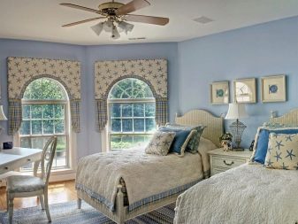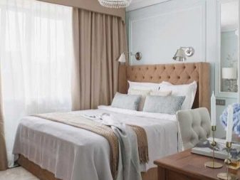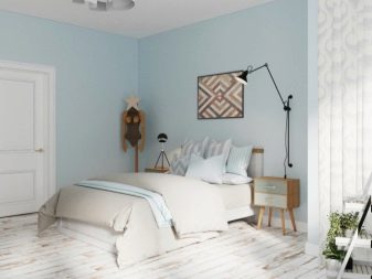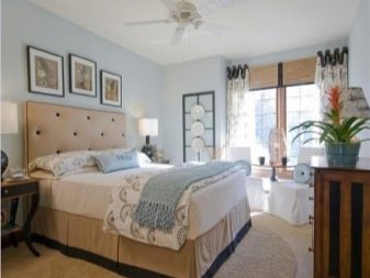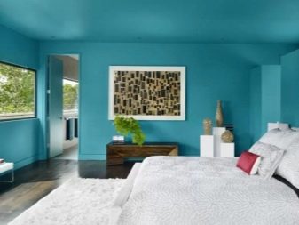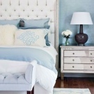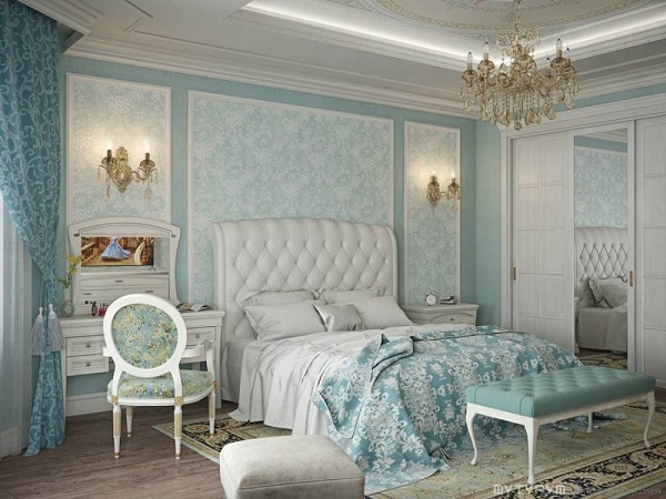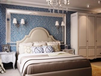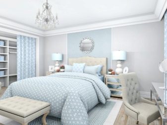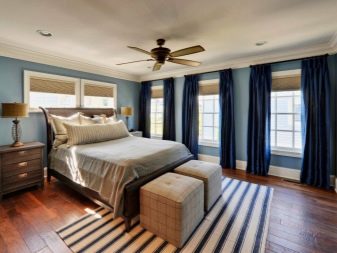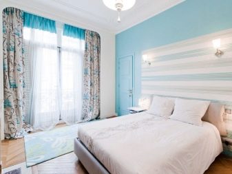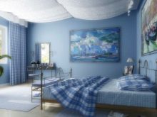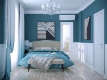 Mavi bir paletteki yatak odası, farklı stilistik yönlerde gerçekleştirilebilir. Mobilya, kaplama malzemeleri ve diğer şeyleri seçmeye başlamadan önce iç mekanın tarzına karar vermelisiniz.