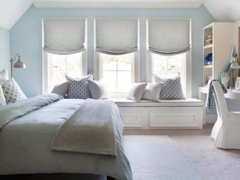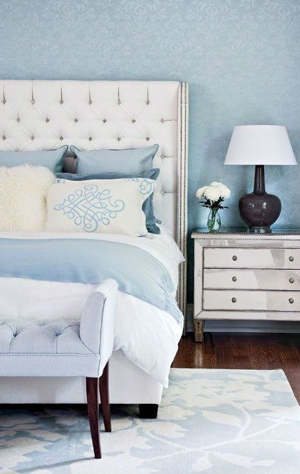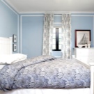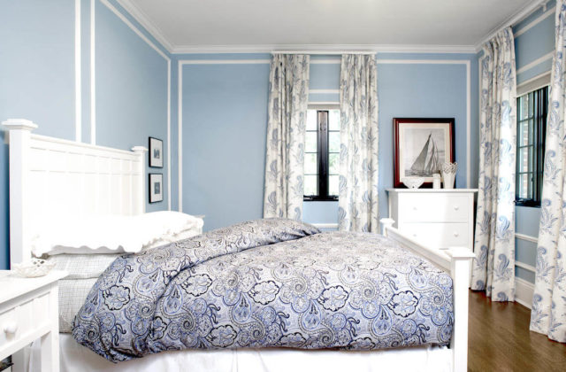 Beyaz klasiktir ve diğer tonlarla harika görünür. Yatak odasının içi için seçilen mavi tonlar, beyaz mobilyalar ve hafif dekoratif unsurlarla uyumludur.