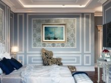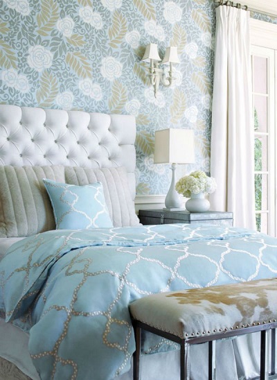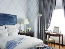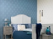 Daha pratik bir seçenek, iki katmanlı dubleks duvar kağıdıdır. Levhalar güçlü ve kabartmalıdır. Bu tür duvar kağıtları muhteşem görünüyor. Yatak odası için genellikle mavi zemin üzerine gümüş süslemeli ürünler tercih edilir.