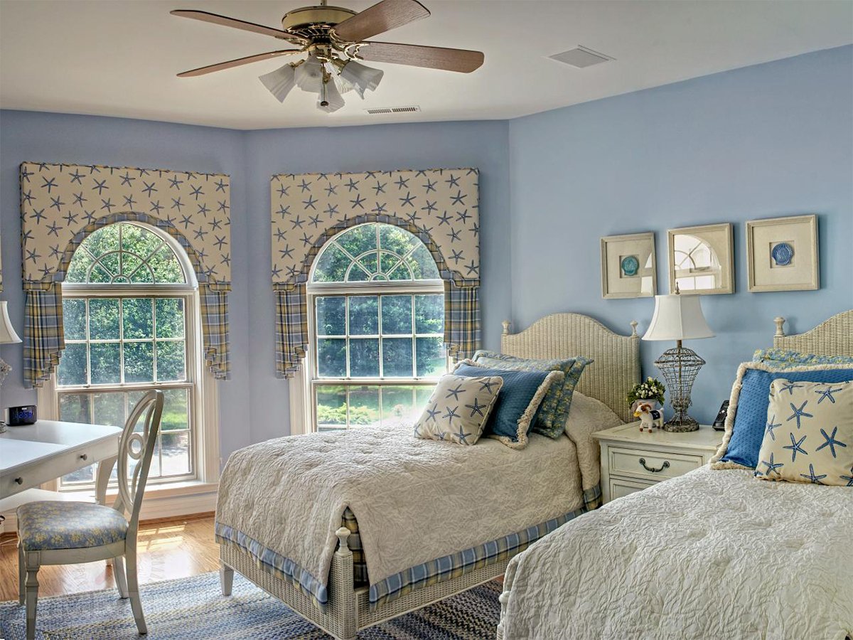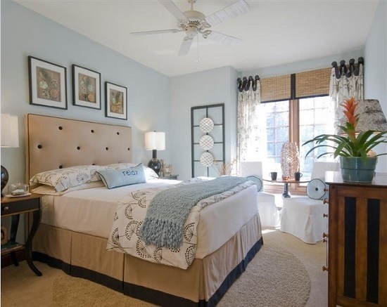 Bu yönün renk paleti beyazın yanı sıra mavi ve kahverengi tonlarını içerir. Bir yatak odası için en uygun kombinasyon: hoş mavi tonlarda duvar kağıdı, kar beyazı tekstiller (çarşaflar, perdeler, yastık kılıfları), bej döşeme. Akdeniz tarzı doğallık üzerine kuruludur. Bir renk şeması seçerken bu dikkate alınmalıdır.
