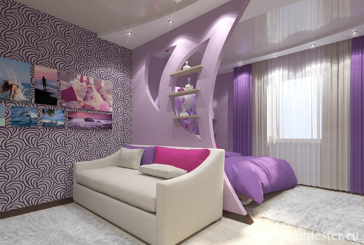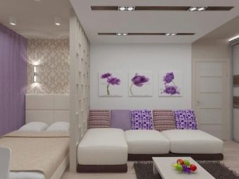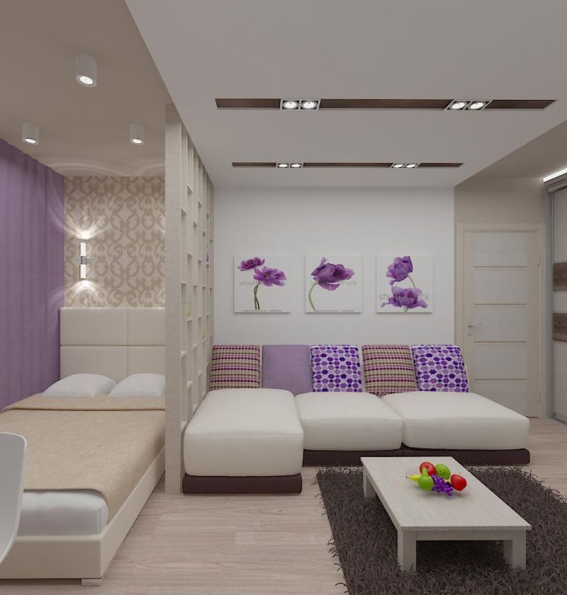 Bir yatak odası ile birleştirilmiş ve yarı kemerle bölünmüş küçük bir oturma odası, mor renklerde dekore edilebilir. Bu renk oldukça sakin, ayrıca mor monokrom duvar kağıdı ve monogramlı varyantlar odayı görsel olarak küçültmez, tam tersi.