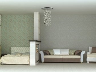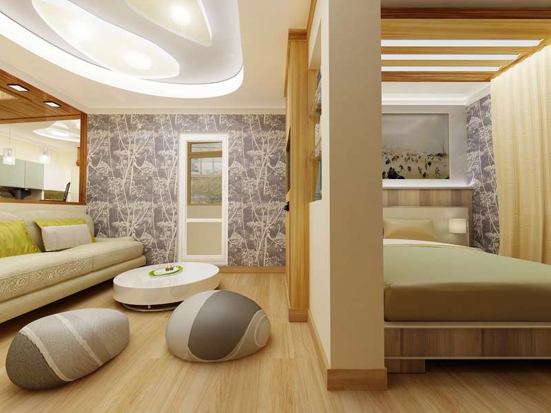 Birkaç çeşit duvar kağıdının yardımıyla, odanın başarılı bir şekilde imar edilmesini, yani fonksiyonel uyku alanını oturma odasından ayırabilirsiniz. Tasarımı başarılı kılmak için birçok uzman, yalnızca birkaç duvar kağıdı türünü değil, aynı zamanda birkaç farklı zemin kaplamasını da birleştirmeyi önerir.