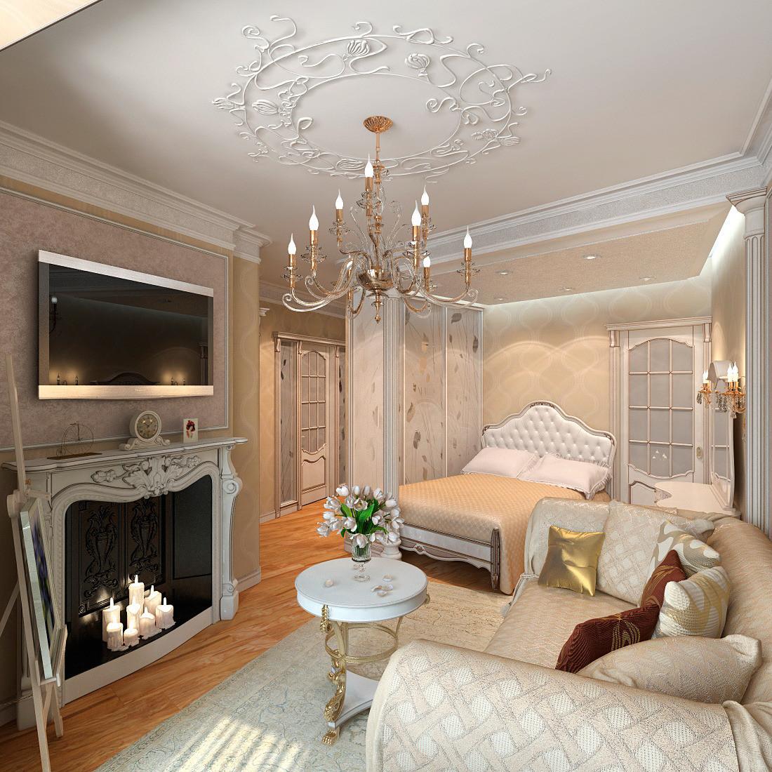 Bir yatak odası-oturma odasını klasik tarzda imar ederken, çıplak bir renk paleti kullanabilirsiniz., ayrıca örneğin monogramlarla çeşitli dokulu kaplamalar.