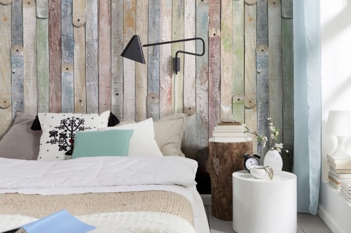 - Ahşap veya ahşap vurguların varlığını seven sakinler, birleşik yatak odası ve oturma odası için çeşitli ahşap dokulu duvar kağıtları seçebilirler. Ancak, yatak odası zaten iç kısımdaki ahşap bölmelerle ayrılmışsa, çiçekli sıradan duvar kağıdı daha az avantajlı görünebilir. Çiçek baskıları, ahşabın her tonuyla mükemmel bir uyum içindedir.