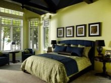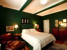 Gerçek bir İngiliz uyku odası, koyu yeşil tonlarda dekore edilmiştir. Buna ek olarak, mavimsi alanların tanıtılması ve şeridin aktif olarak kullanılması önerilir.