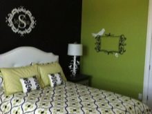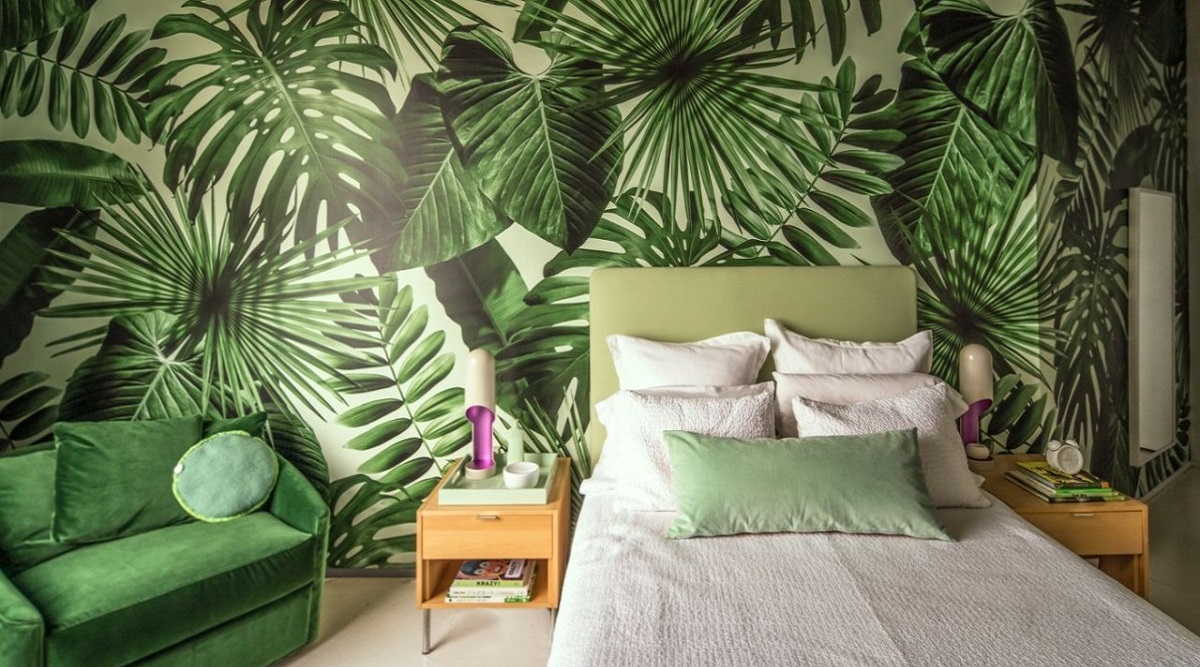Yatak odasının iç kısmındaki yeşil duvar kağıdı
