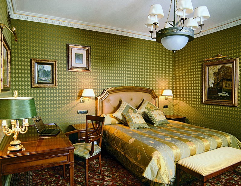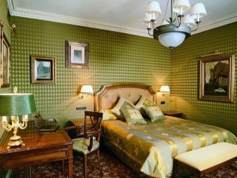 Yeşil duvar kağıdı, tüm yatak odası bir bütün olarak ağırlıklı olarak bu renklerde tasarlanmışsa iyidir. Fotoğraf, kesinlikle eski moda bir ruhla sürdürülen böyle bir çözümü gösteriyor.