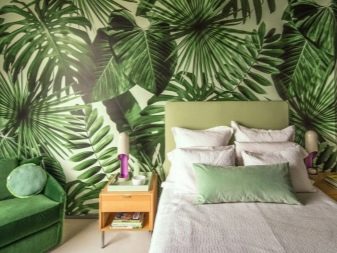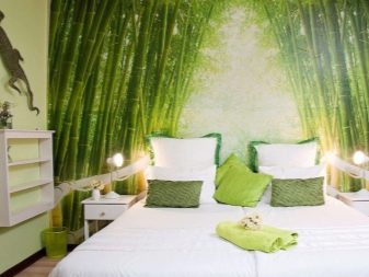 Bir yatak odasını doğal bir ruhla dekore ederken, orman ve koyu yeşil tonları tercih etmeniz gerekir; bu varyantlar bir şekilde sıradan tarla, orman veya bozkır bitki örtüsünün görünümünü yeniden üretir.
