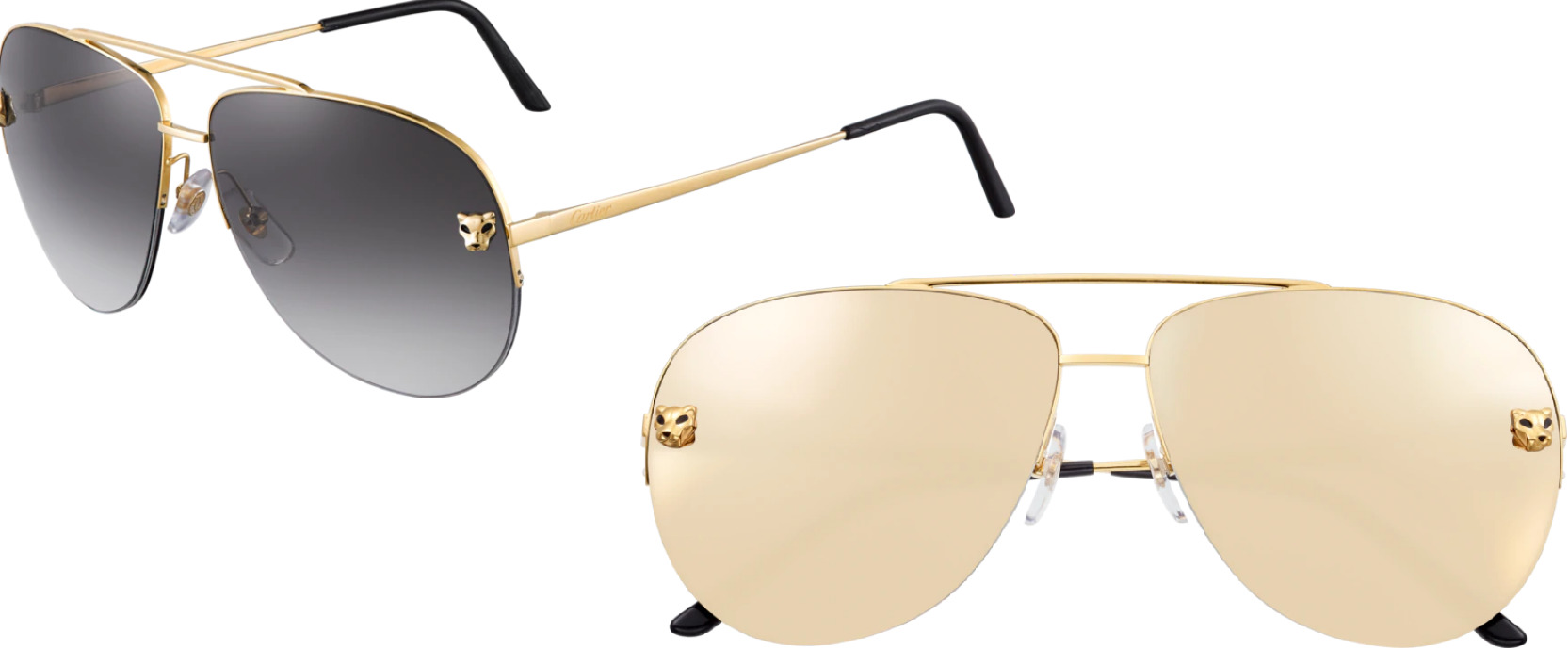 Panthere De Cartier, dekorasyon olarak "panter kafası" motifini kullanan bir seridir. Gözlükler havacı bir şekle, çift köprüye, dereceli renkli camlara, metal çerçevelere ve altın kaplama süslemelere sahiptir. Bu, zengin stili ve inceliği açıkça vurgulayabilen, mücevher süslemeli eşsiz bir gözlük koleksiyonudur.